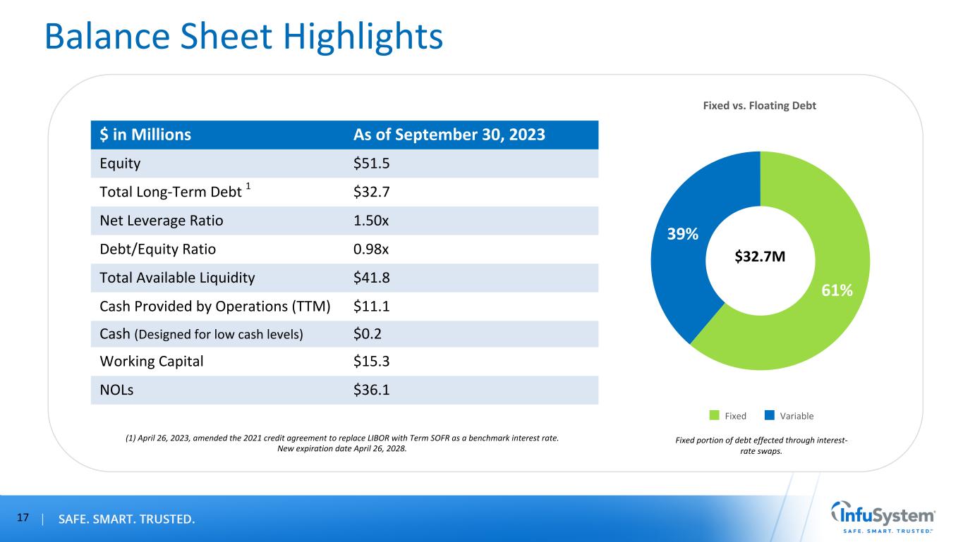 Annual Margin Performance 16 Gross Margin 58.1% 57.8% 60.3% 58.8% 56.9% 52.4% 2018 2019 2020 2021 2022 TTM 9/30/23 —% 10.0% 20.0% 30.0% 40.0% 50.0% 60.0% Adjusted EBITDA Margin 20.5% 22.5% 26.9% 23.5% 18.9% 17.7% 17.0% 2018 2019 2020 2021 2022 TTM 9/30/23 Estimated 2023 —% 5.0% 10.0% 15.0% 20.0% 25.0% 30.0% Patient Services Gross Margin 62.5% 64.2% 65.1% 64.1% 63.1% 61.9% 2018 2019 2020 2021 2022 TTM 9/30/23 —% 10.0% 20.0% 30.0% 40.0% 50.0% 60.0% 70.0% Device Solutions Gross Margin 53.2% 46.7% 52.3% 49.3% 46.6% 37.4% 2018 2019 2020 2021 2022 TTM 9/30/23 —% 10.0% 20.0% 30.0% 40.0% 50.0% 60.0% Patient Services (formerly ITS) (1) See Appendix A. Device Solutions (formerly DME) *Estimates as of 11/7/2023*2020 includes favorable COVID-19 impact on AEBITDA. 17.0% - 18.0%