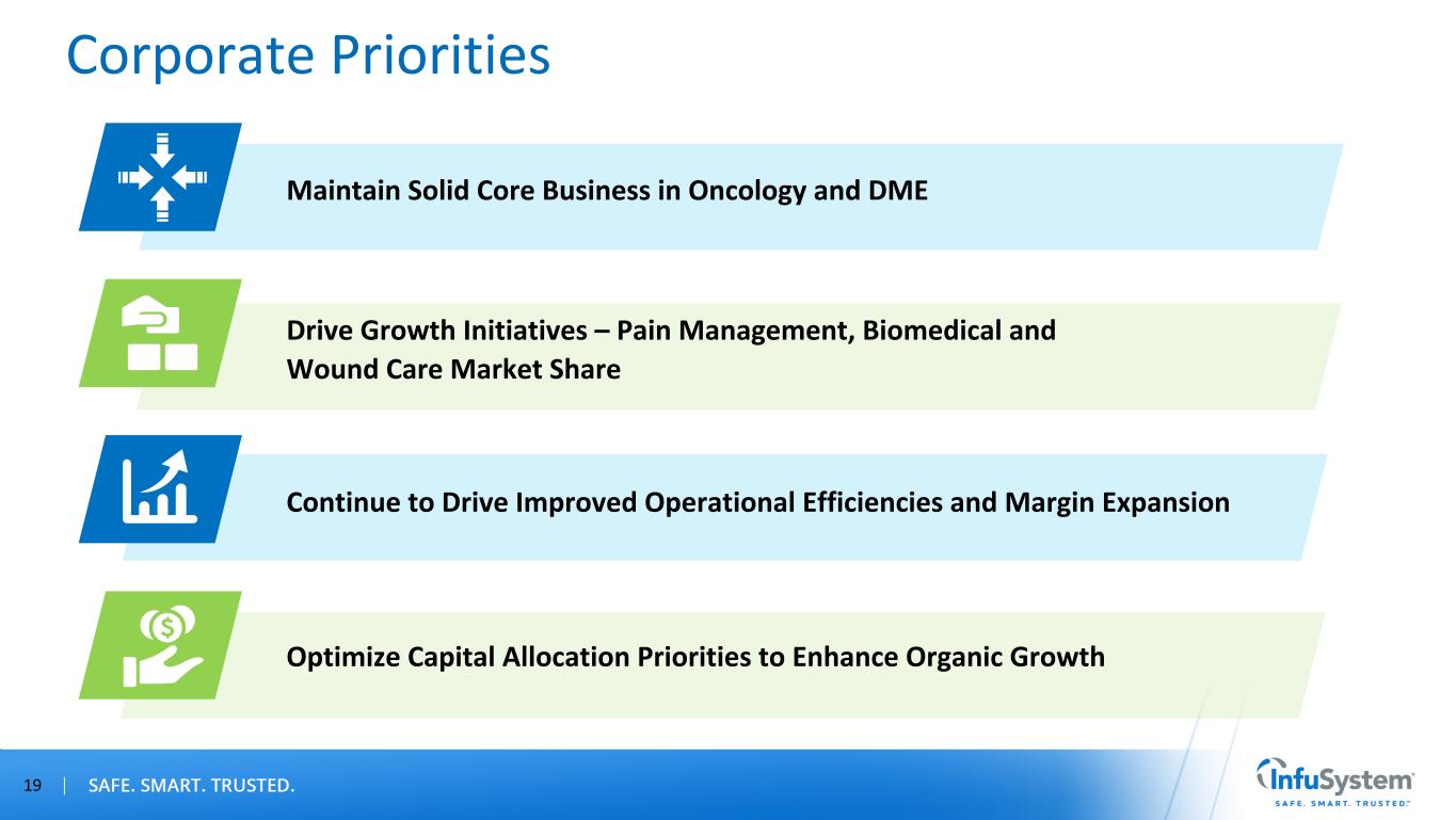 18 Capital Allocation Priorities Investments to Drive Organic Growth Initiatives • Device Solutions – Biomedical Services • Patient Services – SI Wound Care Share Repurchase – Opportunistic • $20M Stock Repurchase Program • $14M Balance as of 9/30/2023 Reduce Debt Levels • Ongoing Financial Flexibility • Maintain Leverage at 1.5x – 2.0x
