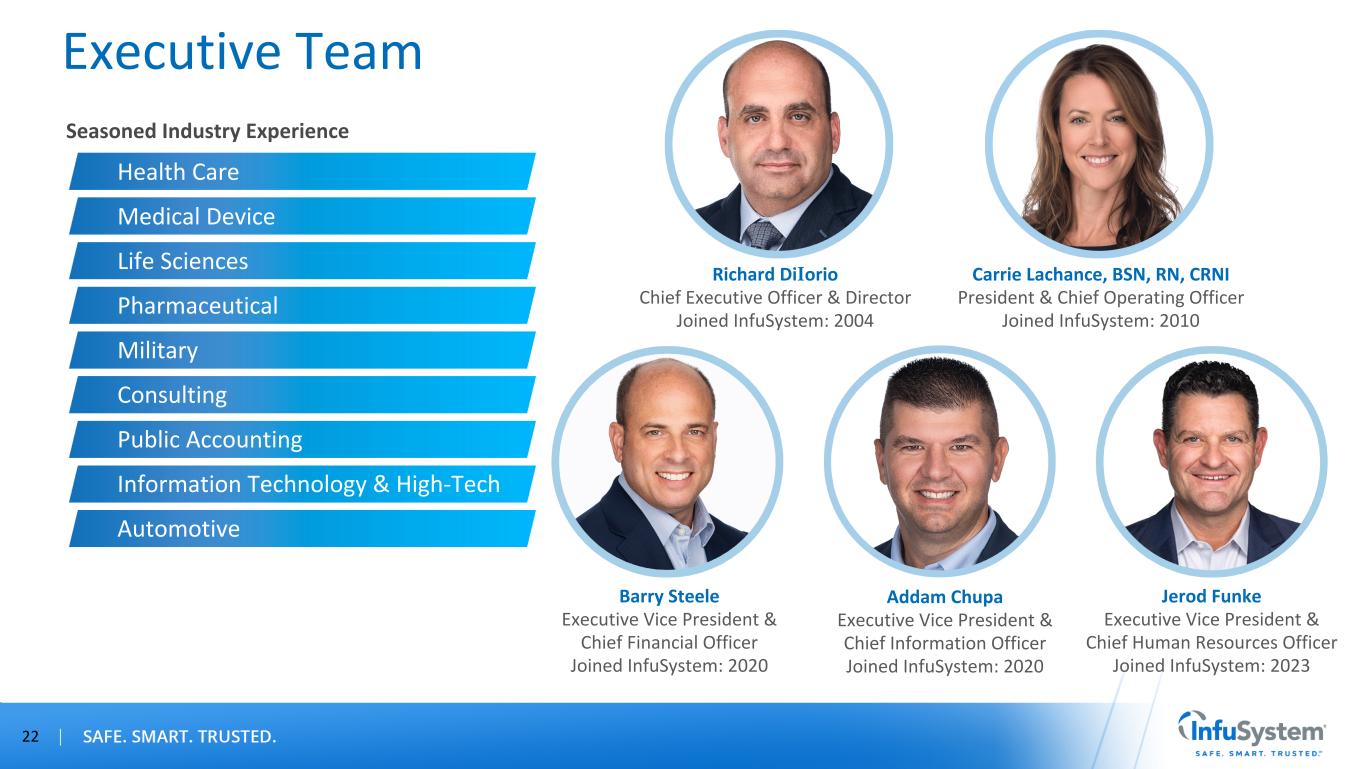 Barry Steele Executive Vice President & Chief Financial Officer Joined InfuSystem: 2020 Richard DiIorio Chief Executive Officer & Director Joined InfuSystem: 2004 Carrie Lachance, BSN, RN, CRNI President & Chief Operating Officer Joined InfuSystem: 2010 Addam Chupa Executive Vice President & Chief Information Officer Joined InfuSystem: 2020 Executive Team Seasoned Industry Experience Health Care Medical Device Life Sciences Pharmaceutical Military Consulting Public Accounting Information Technology & High-Tech Automotive 22 Jerod Funke Executive Vice President & Chief Human Resources Officer Joined InfuSystem: 2023