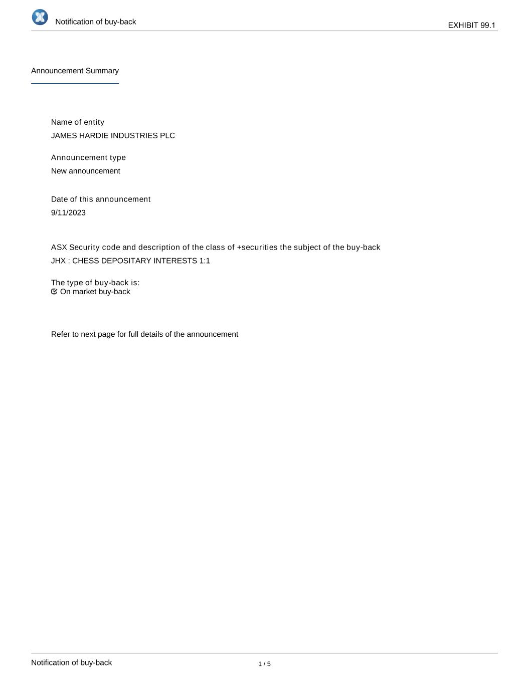 | | Notification of buy-back - JHX |