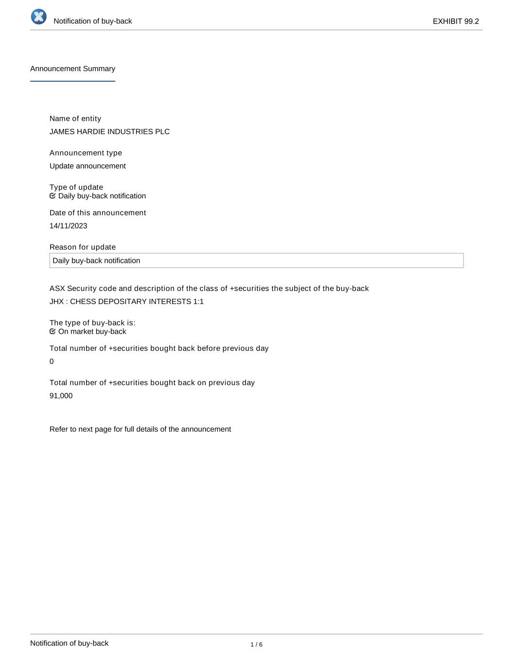 | | Update - Notification of buy-back - JHX |