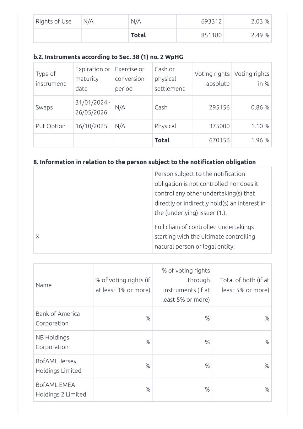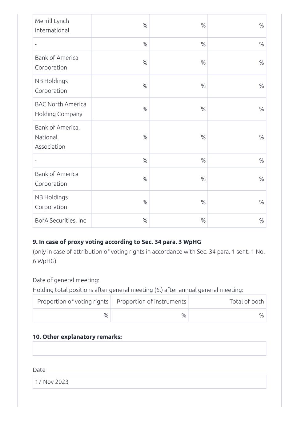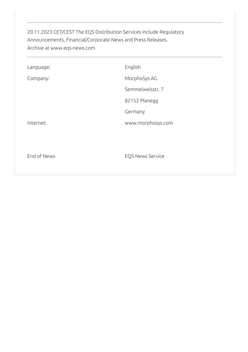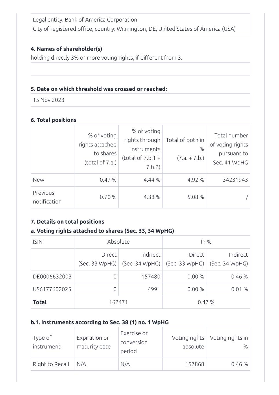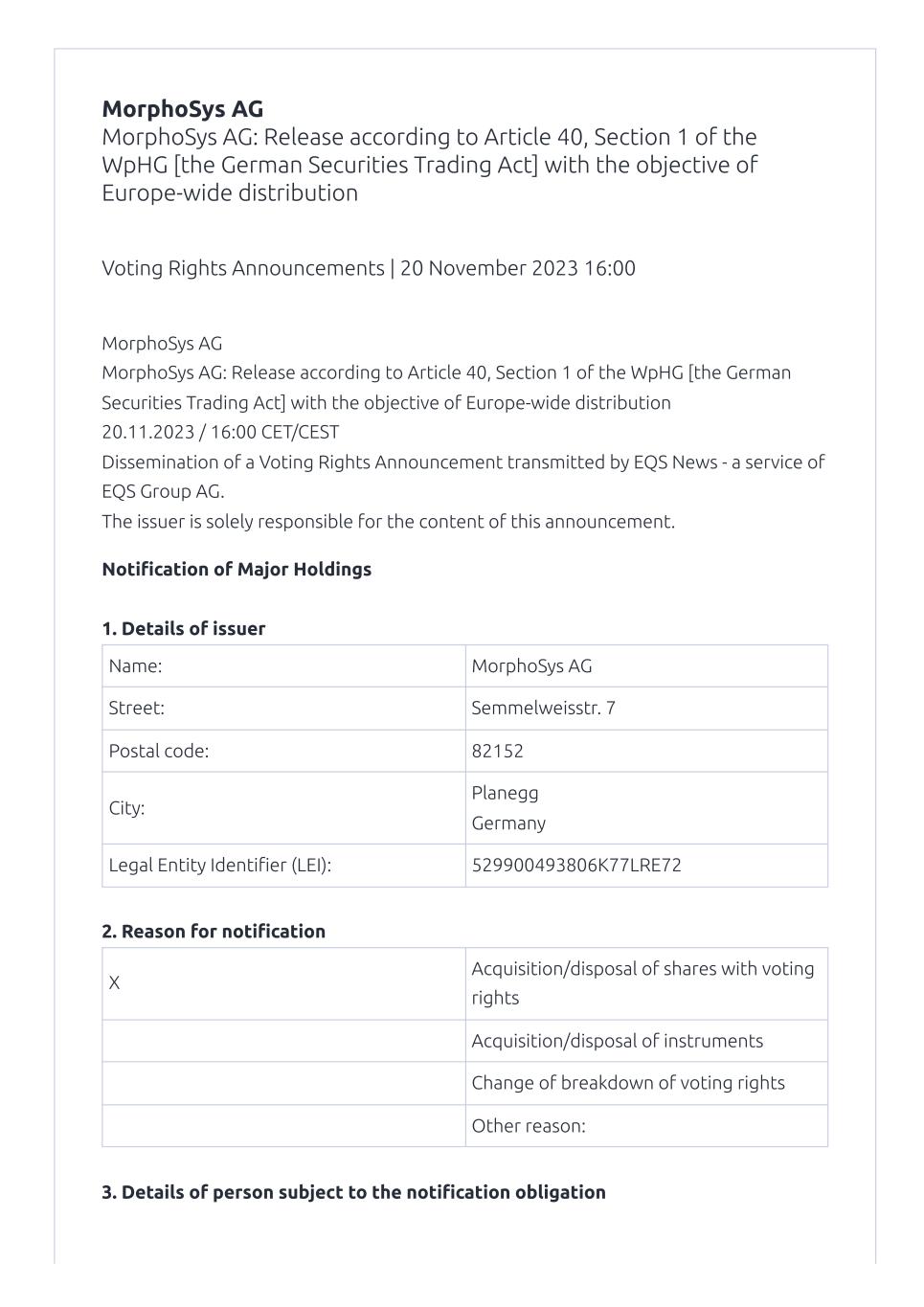 On November 20, 2023, MorphoSys AG (the “Company”) published a notification of major holdings from Bank of America Corporation.