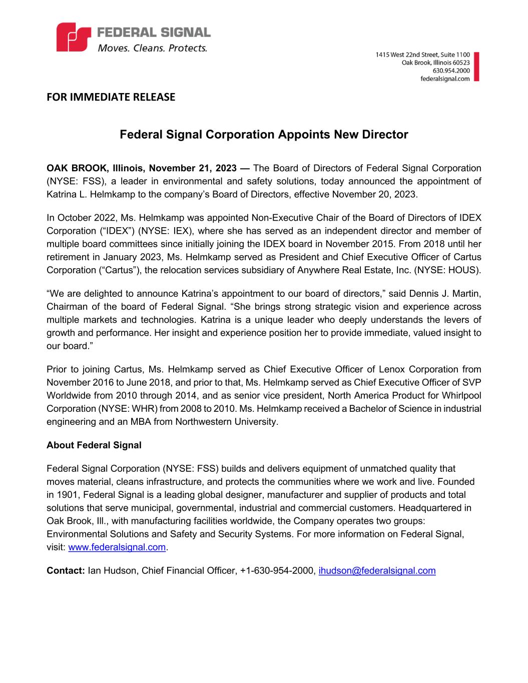 FOR IMMEDIATE RELEASE Federal Signal Corporation Appoints New Director OAK BROOK, Illinois, November 21, 2023 — The Board of Directors of Federal Signal Corporation (NYSE: FSS), a leader in environmental and safety solutions, today announced the appointment of Katrina L. Helmkamp to the company’s Board of Directors, effective November 20, 2023. In October 2022, Ms. Helmkamp was appointed Non-Executive Chair of the Board of Directors of IDEX Corporation (“IDEX”) (NYSE: IEX), where she has served as an independent director and member of multiple board committees since initially joining the IDEX board in November 2015. From 2018 until her retirement in January 2023, Ms. Helmkamp served as President and Chief Executive Officer of Cartus Corporation (“Cartus”), the relocation services subsidiary of Anywhere Real Estate, Inc. (NYSE: HOUS). “We are delighted to announce Katrina’s appointment to our board of directors,” said Dennis J. Martin, Chairman of the board of Federal Signal. “She brings strong strategic vision and experience across multiple markets and technologies. Katrina is a unique leader who deeply understands the levers of growth and performance. Her insight and experience position her to provide immediate, valued insight to our board.” Prior to joining Cartus, Ms. Helmkamp served as Chief Executive Officer of Lenox Corporation from November 2016 to June 2018, and prior to that, Ms. Helmkamp served as Chief Executive Officer of SVP Worldwide from 2010 through 2014, and as senior vice president, North America Product for Whirlpool Corporation (NYSE: WHR) from 2008 to 2010. Ms. Helmkamp received a Bachelor of Science in industrial engineering and an MBA from Northwestern University. About Federal Signal Federal Signal Corporation (NYSE: FSS) builds and delivers equipment of unmatched quality that moves material, cleans infrastructure, and protects the communities where we work and live. Founded in 1901, Federal Signal is a leading global designer, manufacturer and supplier of products and total solutions that serve municipal, governmental, industrial and commercial customers. Headquartered in Oak Brook, Ill., with manufacturing facilities worldwide, the Company operates two groups: Environmental Solutions and Safety and Security Systems. For more information on Federal Signal, visit: www.federalsignal.com. Contact: Ian Hudson, Chief Financial Officer, +1-630-954-2000, ihudson@federalsignal.com
