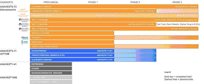Our lead product candidate, ANAVEX®2-73 (blarcamesine), is being developed to treat Alzheimer’s disease, Parkinson’s disease and potentially other central nervous system diseases, including rare diseases, such as Rett syndrome, a rare severe neurological monogenic disorder caused by mutations in the X-linked gene, methyl-CpG-binding protein 2 (“MECP2”).