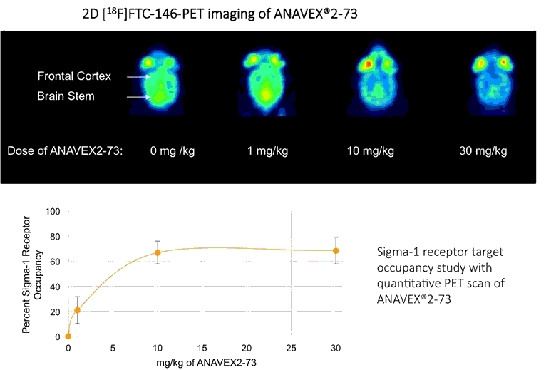 Anavex has a portfolio of compounds varying in sigma-1 receptor (SIGMAR1) binding activities. The SIGMAR1 gene encodes the SIGMAR1 protein, which is an intracellular chaperone protein with important roles in cellular communication. SIGMAR1 is also involved in transcriptional regulation at the nuclear envelope and restores homeostasis and stimulates recovery of cell function when activated. In order to validate the ability of our compounds to activate quantitatively the SIGMAR1, we performed, in collaboration with Stanford University, a quantitative Positron Emission Tomography (PET) imaging scan in mice, which demonstrated a dose-dependent ANAVEX®2-73 (blarcamesine) target engagement or receptor occupancy with SIGMAR1 in the brain.