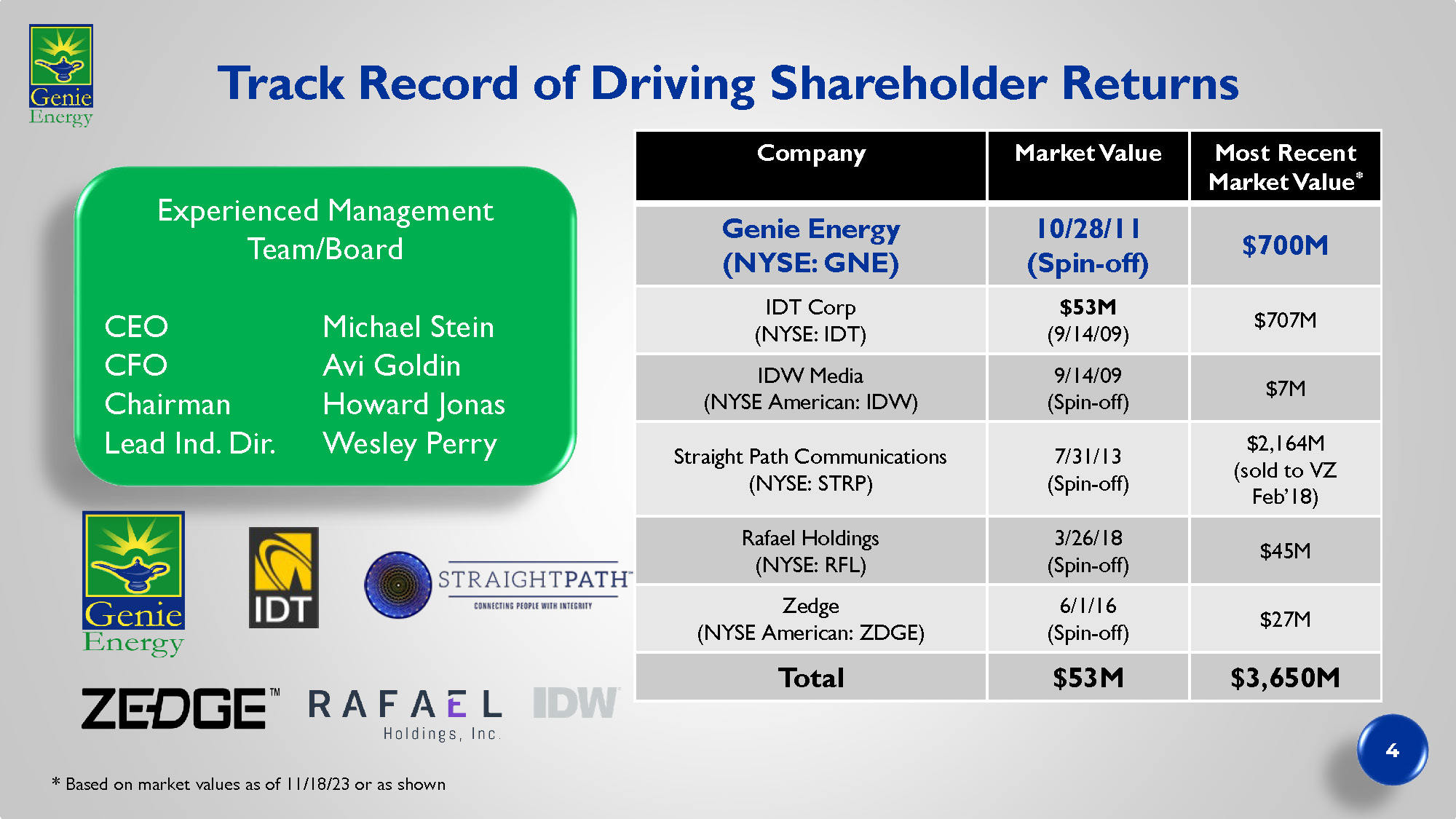 Track Record of Driving Shareholder Returns Most Recent Market Value * Market Value Company $700M 10/28/11 (Spin - off) Genie Energy (NYSE: GNE) $707M $53M (9/14/09) IDT Corp (NYSE: IDT) $7M 9/14/09 (Spin - off) IDW Media (NYSE American: IDW) $2,164M (sold to VZ Feb’18) 7/31/13 (Spin - off) Straight Path Communications (NYSE: STRP) $45M 3/26/18 (Spin - off) Rafael Holdings (NYSE: RFL) $27M 6/1/16 (Spin - off) Zedge (NYSE American: ZDGE) $3,650M $53M Total * Based on market values as of 11/18/23 or as shown Experienced Management Team/Board CEO Michael Stein CFO Avi Goldin Chairman Howard Jonas Lead Ind. Dir. Wesley Perry 4