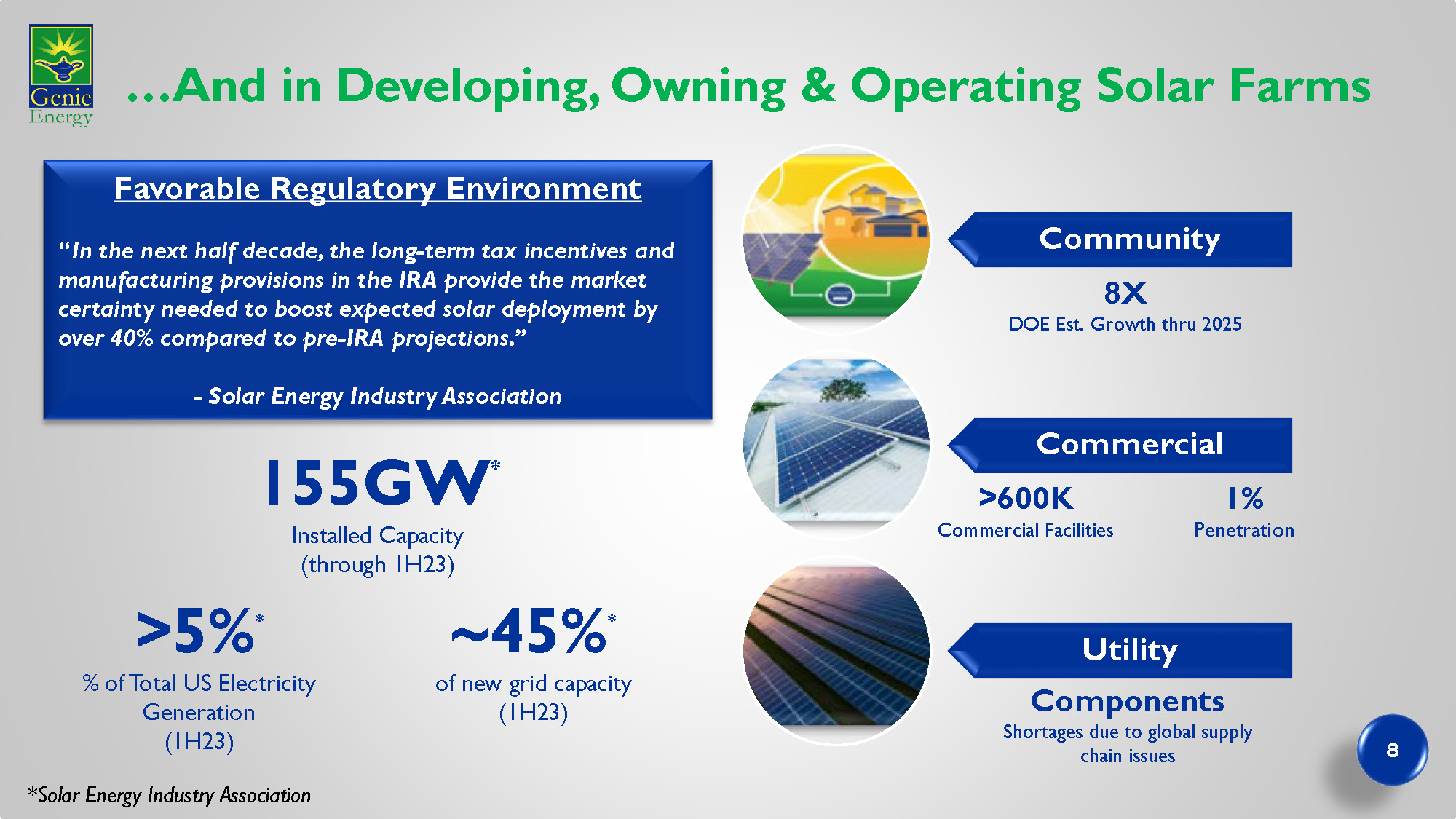 …And in Developing, Owning & Operating Solar Farms *Solar Energy Industry Association Community Commercial Utility >600K Commercial Facilities 1% Penetration Components Shortages due to global supply chain issues 8X DOE Est. Growth thru 2025 Favorable Regulatory Environment “ In the next half decade, the long - term tax incentives and manufacturing provisions in the IRA provide the market certainty needed to boost expected solar deployment by over 40% compared to pre - IRA projections.” - Solar Energy Industry Association >5% * % of Total US Electricity Generation (1H23) ~45% * of new grid capacity (1H23) 155GW * Installed Capacity (through 1H23) 8