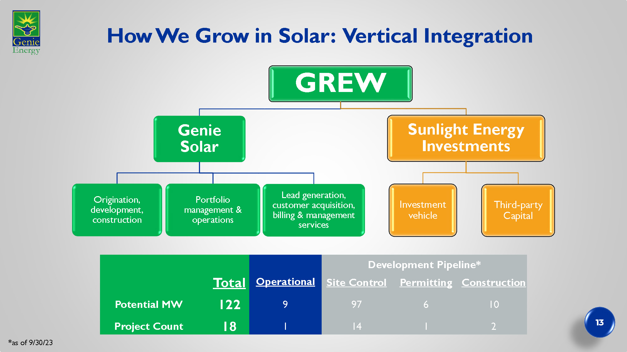 How We Grow in Solar: Vertical Integration GREW Genie Solar Origination, development, construction Portfolio management & operations Lead generation, customer acquisition, billing & management services Sunlight Energy Investments Investment vehicle Third - party Capital 13 Development Pipeline* Construction Permitting Site Control Operational Total 10 6 97 9 122 Potential MW 2 1 14 1 18 Project Count *as of 9/30/23