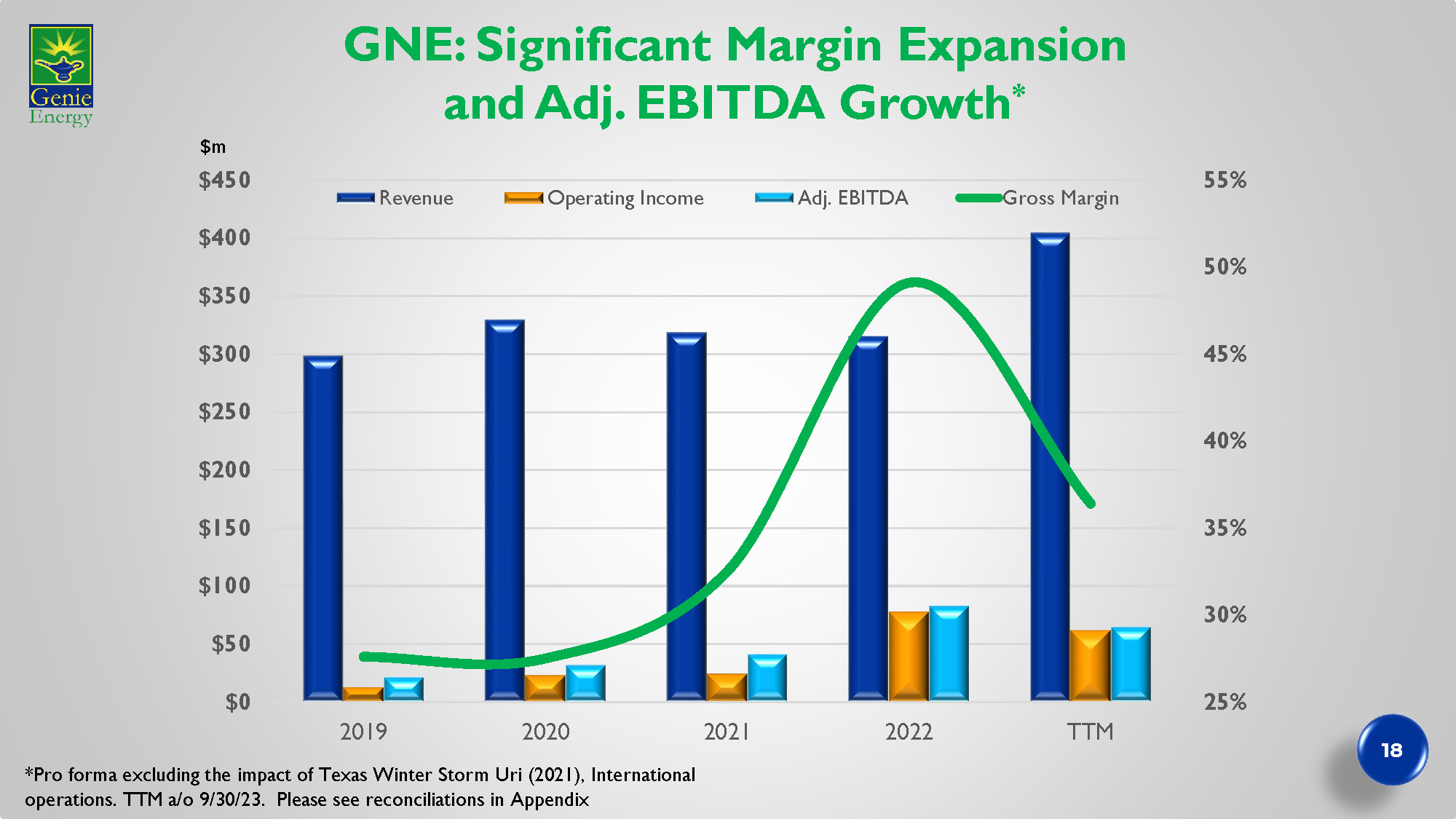 GNE: Significant Margin Expansion and Adj. EBITDA Growth * 25% 30% 35% 40% 45% 50% 55% $0 $50 $100 $150 $200 $250 $300 $350 $400 $450 2019 2020 2021 2022 TTM Revenue Operating Income Adj. EBITDA Gross Margin $m *Pro forma excluding the impact of Texas Winter Storm Uri (2021), International operations. TTM a/o 9/30/23. Please see reconciliations in Appendix 18
