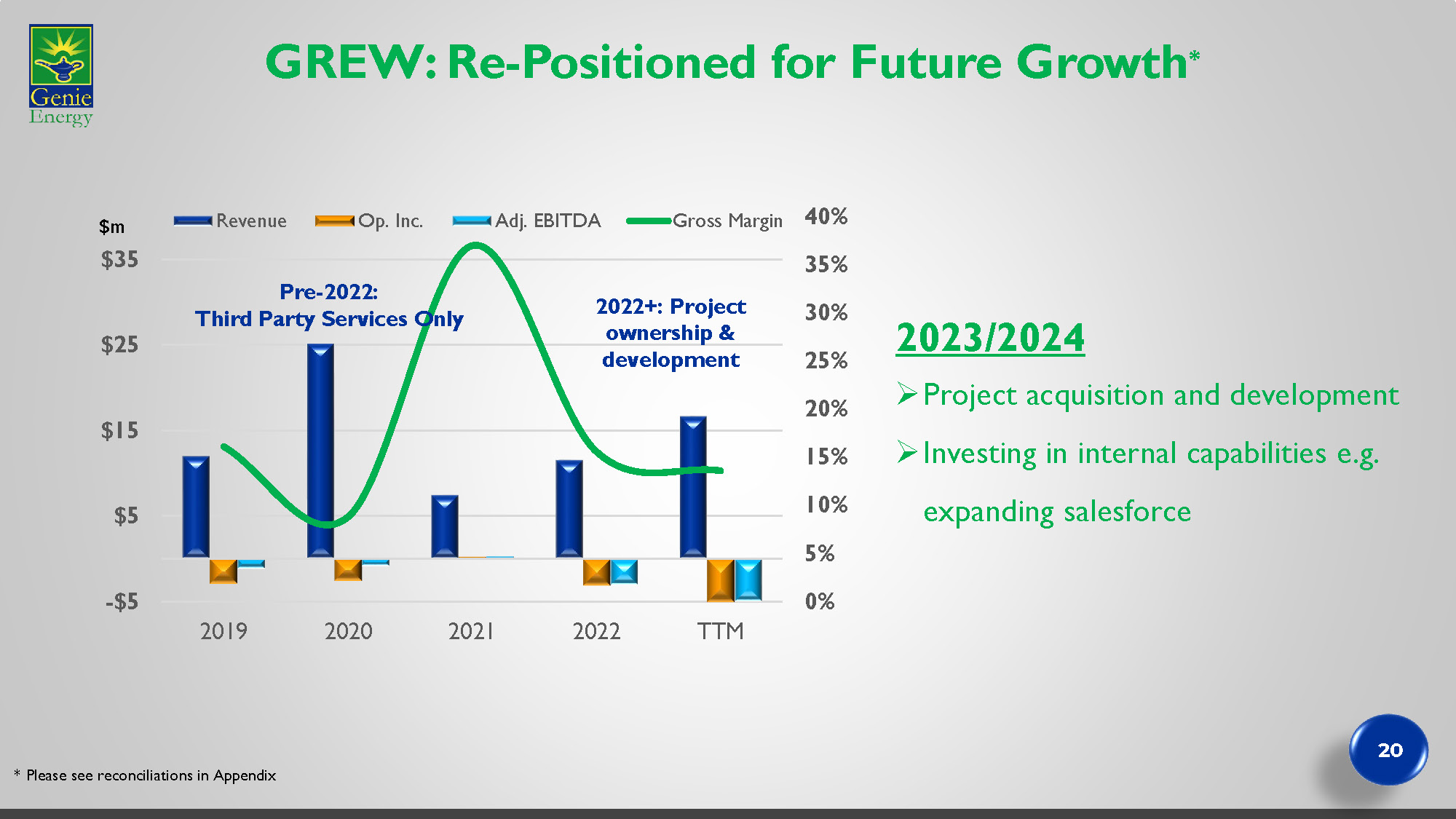 Driven by GRE Strength* 25% 30% 35% 40% 45% 50% 55% 60% $0 $50 $100 $150 $200 $250 $300 $350 $400 2019 2020 2021 2022 TTM Revenue Op. Inc. Adj. EBITDA Gross Margin $m *Pro forma excluding the impact of Texas Winter Storm Uri (2021) TTM a/o 9/30/23 Please see reconciliations in Appendix 19