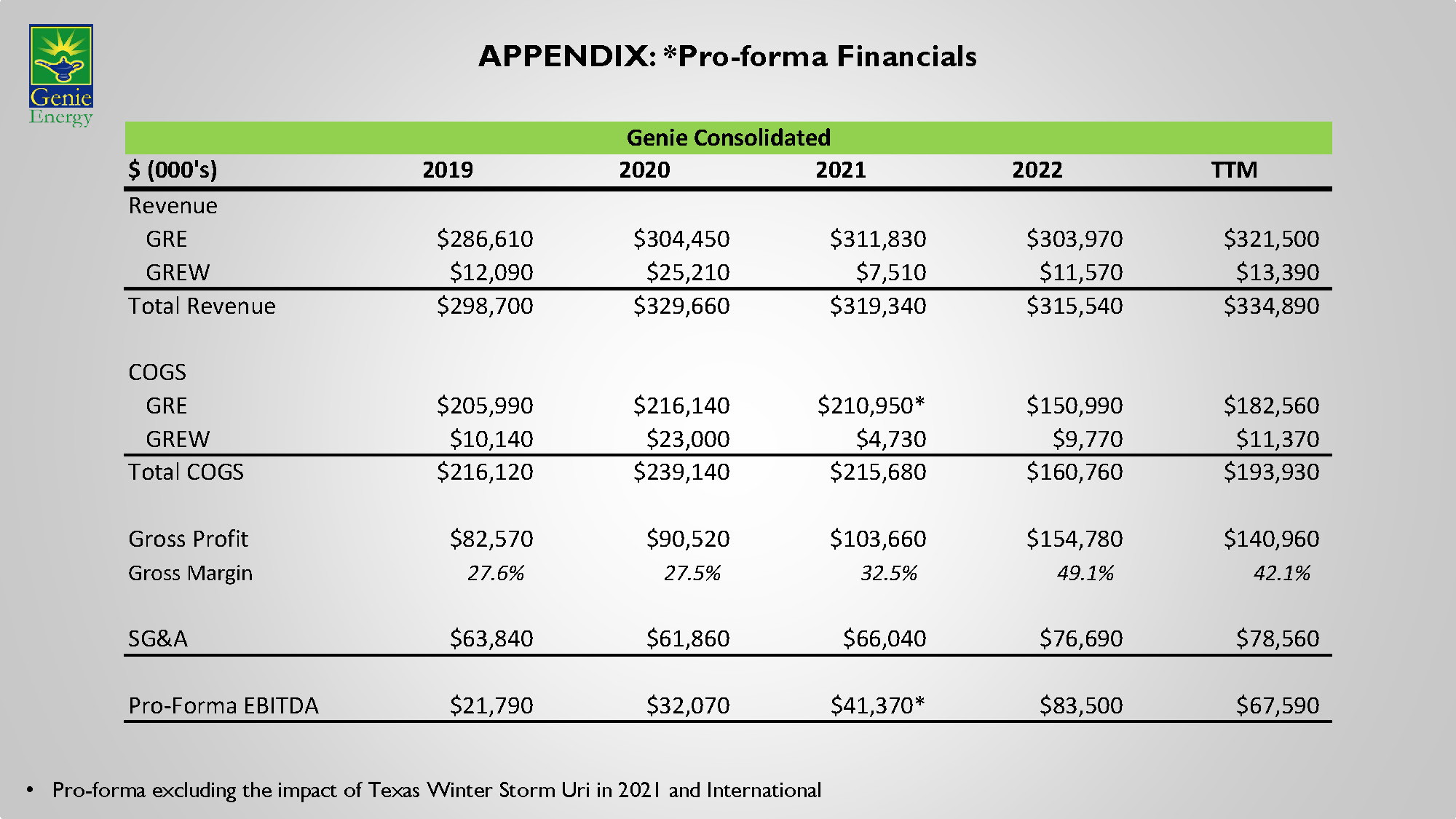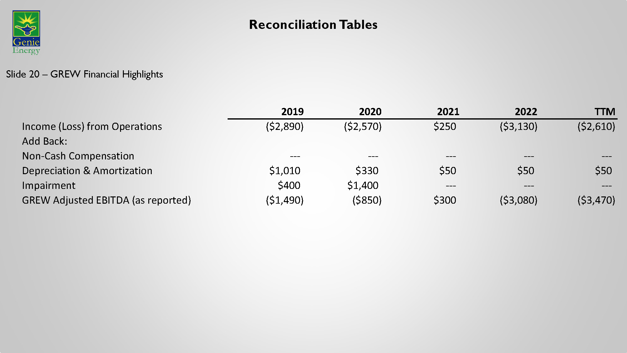 Reconciliation Tables Slides 18,26 – Genie Energy Financials - Consolidated 2019 2020 2021 2022 TTM Consolidated revenue (as reported) $300,100 $338,430 $323,270 $315,540 $334,890 Less: Revenue of Genie Japan $1,400 $8,770 $3,930 --- --- Pro forma consolidated revenue $298,700 $329,660 $319,340 $315,540 $334,890 Consolidated gross profit (as reported) $82,330 $91,480 $91,640 $154,780 $140,960 Less Gross profit (loss) of GREI ($240) $960 ($2,020) --- --- Gross (loss) profit from Winter Storm Uri --- --- ($10,000) --- --- Pro-forma consolidated gross profit $82,570 $90,520 $103,660 $154,780 $140,960 Pro forma consolidated gross profit margin 27.6% 27.5% 32.5% 49.1% 42.1% Income (Loss) from Operations $12,620 $23,140 $24,530 $77,740 $62,120 Add Back: Non-Cash Compensation $1,050 $970 $2,820 $2,970 $3,000 Depreciation & Amortization $1,960 $1,100 $440 $390 $380 Impairment $400 $1,400 --- $2,070 $2,080 Consolidated Adjusted EBITDA (as reported) $16,020 $26,610 $27,780 $83,160 $67,590 Less: Adjusted EBITDA of GREI ($4,500) ($3,340) ($3,360) --- --- Profit (loss) from Winter Storm Uri --- --- ($10,000) --- --- Adjusted EBITDA of GOGAS ($1,260) ($2,120) ($180) --- --- Pro forma consolidated Adjusted EBITDA $21,790 $32,070 $41,320 $83,160 $67,590 BS0