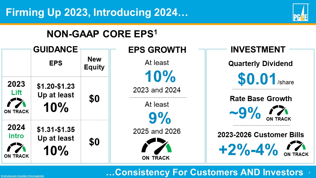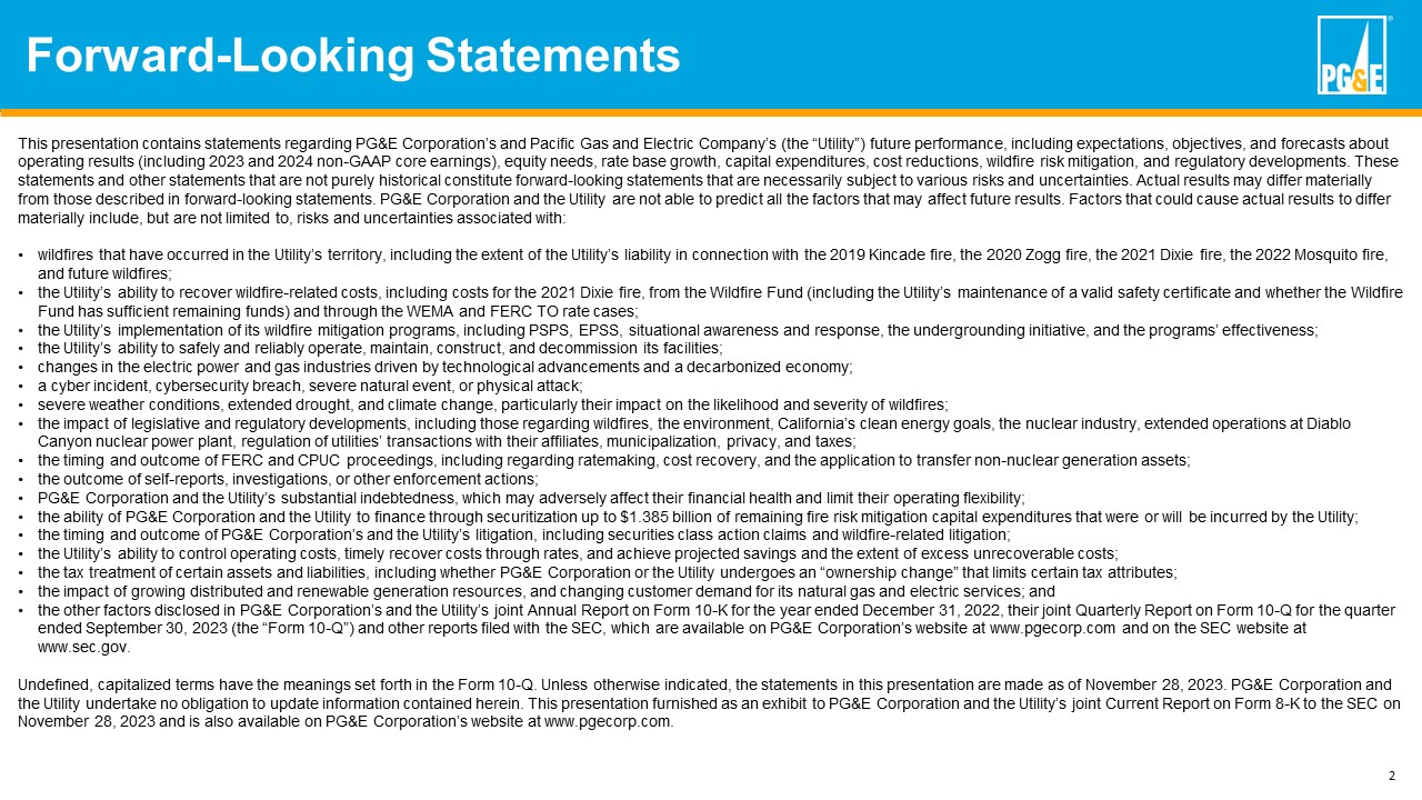 2 Forward - Looking Statements This presentation contains statements regarding PG&E Corporation’s and Pacific Gas and Electric Company’s (the “Utility”) fut ure performance, including expectations, objectives, and forecasts about operating results (including 2023 and 2024 non - GAAP core earnings), equity needs, rate base growth, capital expenditures, cost reductions , wildfire risk mitigation, and regulatory developments. These statements and other statements that are not purely historical constitute forward - looking statements that are necessarily subjec t to various risks and uncertainties. Actual results may differ materially from those described in forward - looking statements. PG&E Corporation and the Utility are not able to predict all the factors tha t may affect future results. Factors that could cause actual results to differ materially include, but are not limited to, risks and uncertainties associated with: • wildfires that have occurred in the Utility’s territory, including the extent of the Utility’s liability in connection with t he 2019 Kincade fire, the 2020 Zogg fire, the 2021 Dixie fire, the 2022 Mosquito fire, and future wildfires; • the Utility’s ability to recover wildfire - related costs, including costs for the 2021 Dixie fire, from the Wildfire Fund (includ ing the Utility’s maintenance of a valid safety certificate and whether the Wildfire Fund has sufficient remaining funds) and through the WEMA and FERC TO rate cases; • the Utility’s implementation of its wildfire mitigation programs, including PSPS, EPSS, situational awareness and response, t he undergrounding initiative, and the programs’ effectiveness; • the Utility’s ability to safely and reliably operate, maintain, construct, and decommission its facilities; • changes in the electric power and gas industries driven by technological advancements and a decarbonized economy; • a cyber incident, cybersecurity breach, severe natural event, or physical attack; • severe weather conditions, extended drought, and climate change, particularly their impact on the likelihood and severity of wil dfires; • the impact of legislative and regulatory developments, including those regarding wildfires, the environment, California’s cle an energy goals, the nuclear industry, extended operations at Diablo Canyon nuclear power plant, regulation of utilities’ transactions with their affiliates, municipalization, privacy, and taxes ; • the timing and outcome of FERC and CPUC proceedings, including regarding ratemaking , cost recovery, and the application to transfer non - nuclear generation assets; • the outcome of self - reports, investigations, or other enforcement actions; • PG&E Corporation and the Utility’s substantial indebtedness, which may adversely affect their financial health and limit thei r o perating flexibility; • the ability of PG&E Corporation and the Utility to finance through securitization up to $1.385 billion of remaining fire risk mi tigation capital expenditures that were or will be incurred by the Utility; • the timing and outcome of PG&E Corporation’s and the Utility’s litigation, including securities class action claims and wildf ire - related litigation; • the Utility’s ability to control operating costs, timely recover costs through rates, and achieve projected savings and the e xte nt of excess unrecoverable costs; • the tax treatment of certain assets and liabilities, including whether PG&E Corporation or the Utility undergoes an “ownershi p c hange” that limits certain tax attributes; • the impact of growing distributed and renewable generation resources, and changing customer demand for its natural gas and el ect ric services; and • the other factors disclosed in PG&E Corporation’s and the Utility’s joint Annual R eport on Form 10 - K for the year ended December 31, 2022, their joint Quarterly R eport on Form 10 - Q for the quarter ended September 30 , 2023 (the “Form 10 - Q”) and other reports filed with the SEC, which are available on PG&E Corporation’s website at www.pgecorp. com and on the SEC website at www.sec.gov. Undefined, capitalized terms have the meanings set forth in the Form 10 - Q. Unless otherwise indicated, the statements in this pr esentation are made as of November 28 , 2023. PG&E Corporation and the Utility undertake no obligation to update information contained herein. This presentation furnished as an exhibit to PG&E Co rporation and the Utility’s joint Current Report on Form 8 - K to the SEC on November 28 , 2023 and is also available on PG&E Corporation’s website at www.pgecorp.com.