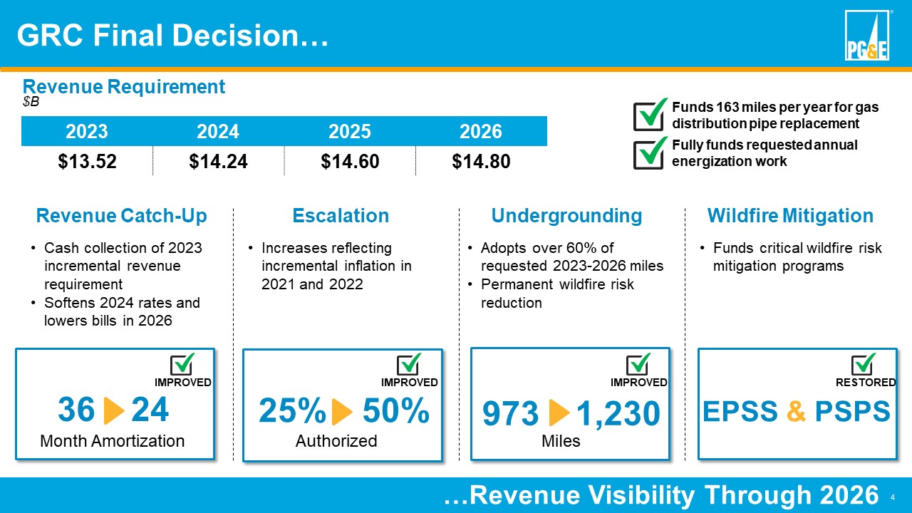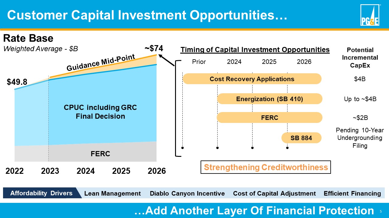 4 GRC Final Decision… …Revenue Visibility Through 2026 2026 2025 2024 2023 $14.80 $14.60 $14.24 $13.52 Revenue Catch - Up • Cash collection of 2023 incremental revenue requirement • Softens 2024 rates and lowers bills in 2026 Escalation • Increases reflecting incremental inflation in 2021 and 2022 Undergrounding • Adopts over 60% of requested 2023 - 2026 miles • Permanent wildfire risk reduction Wildfire Mitigation • F unds critical wildfire risk mitigation programs Authorized Miles EPSS & PSPS Month Amortization Funds 163 miles per year for gas distribution pipe replacement Fully f unds requested annual energization work Revenue Requirement $B IMPROVED 36 24 25% 50% IMPROVED IMPROVED 973 1,230 RESTORED