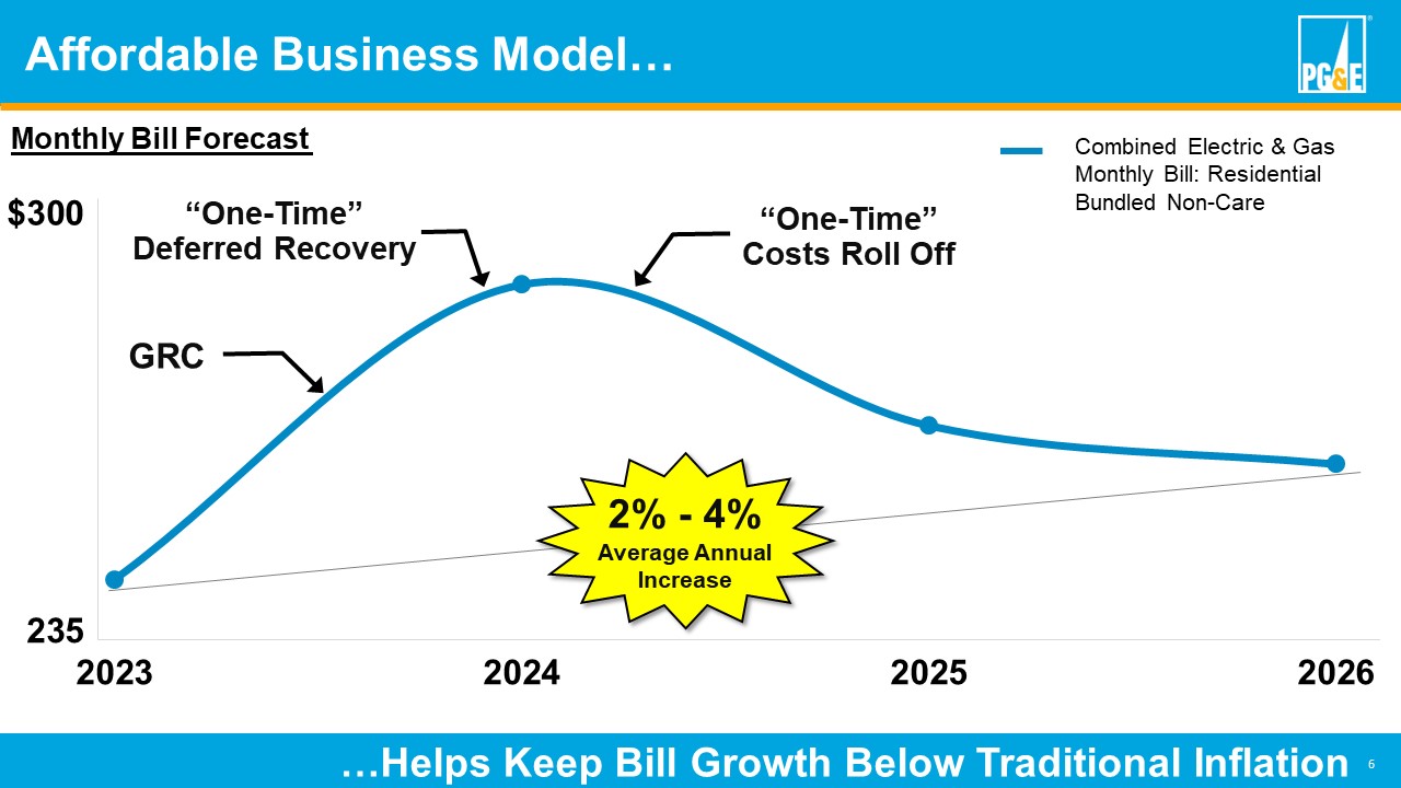 5 2022 2023 2024 2025 2026 CPUC including GRC Final Decision FERC Customer Capital Investment Opportunities… …Add Another Layer Of Financial Protection Rate Base Weighted Average - $B Potential Incremental CapEx $ 4 B Cost Recovery Applications ~$2B FERC Pending 10 - Year Undergrounding Filing SB 884 ~$74 Up to ~$4B Energization (SB 410) Efficient Financing Cost of Capital Adjustment Diablo Canyon Incentive Lean Management Affordability Drivers 2026 2025 2024 Prior Timing of Capital Investment Opportunities Strengthening Creditworthiness $49.8