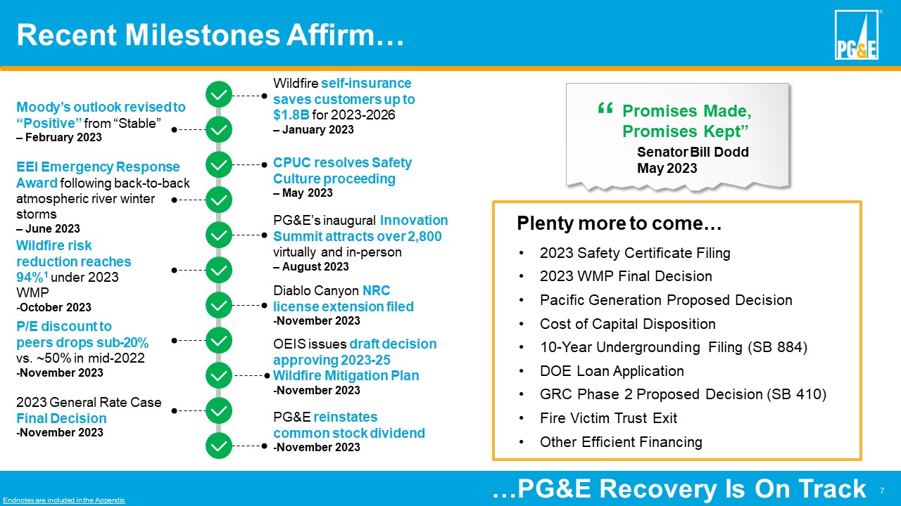 7 Endnotes are included in the Appendix. Recent Milestones Affirm… …PG&E Recovery Is On Track Wildfire self - insurance saves customers up to $1.8B for 2023 - 2026 – January 2023 Moody’s outlook revised to “Positive” from “Stable” – February 2023 CPUC resolves Safety Culture proceeding – May 2023 EEI Emergency Response Award following back - to - back atmospheric river winter storms – June 2023 PG&E’s inaugural Innovation Summit attracts over 2,800 virtually and in - person – August 2023 Diablo Canyon NRC license extension filed - November 2023 Wildfire risk reduction reaches 94% 1 under 2023 WMP - October 2023 2023 General Rate Case Final Decision - November 2023 PG&E reinstates common stock dividend - November 2023 Plenty more to come… • 2023 Safety Certificate Filing • 2023 WMP Final Decision • Pacific Generation Proposed Decision • Cost of Capital Disposition • 10 - Year Undergrounding Filing (SB 884) • DOE Loan Application • GRC Phase 2 Proposed Decision (SB 410) • Fire Victim Trust Exit • Other Efficient Financing OEIS issues draft decision approving 2023 - 25 Wildfire Mitigation Plan - November 2023 P/E discount to peers drops sub - 20% vs. ~50% in mid - 2022 - November 2023 “ Senator Bill Dodd May 2023 Promises Made, Promises Kept”