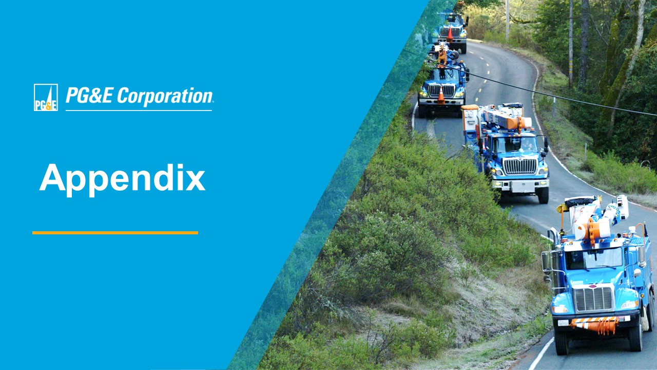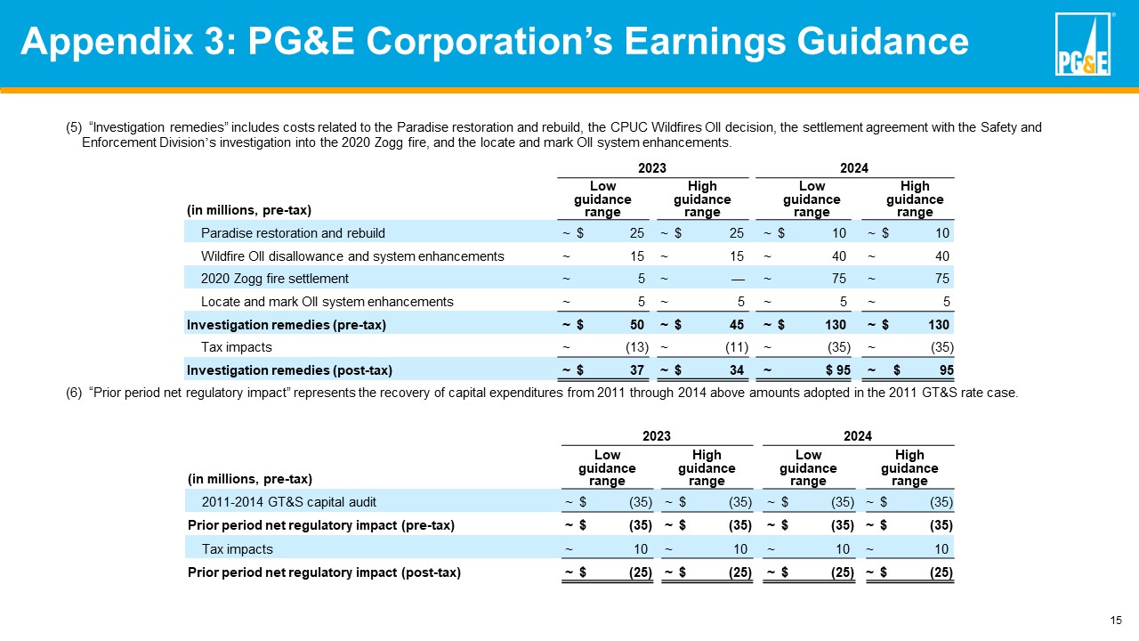 15 (6) “Prior period net regulatory impact” represents the recovery of capital expenditures from 2011 through 2014 above amount s a dopted in the 2011 GT&S rate case. (5) “Investigation remedies” includes costs related to the Paradise restoration and rebuild, the CPUC Wildfires OII decision, the settlement agreement with the Safety and Enforcement Division ’ s investigation into the 2020 Zogg fire, and the locate and mark OII system enhancements. Appendix 3: PG&E Corporation’s Earnings Guidance 2024 2023 High guidance range Low guidance range High guidance range Low guidance range (in millions, pre - tax) $ 10 ~ $ 10 ~ $ 25 ~ $ 25 ~ Paradise restoration and rebuild 40 ~ 40 ~ 15 ~ 15 ~ Wildfire OII disallowance and system enhancements 75 ~ 75 ~ — ~ 5 ~ 2020 Zogg fire settlement 5 ~ 5 ~ 5 ~ 5 ~ Locate and mark OII system enhancements $ 130 ~ $ 130 ~ $ 45 ~ $ 50 ~ Investigation remedies (pre - tax) (35) ~ (35) ~ (11) ~ (13) ~ Tax impacts $ 95 ~ $ 95 ~ $ 34 ~ $ 37 ~ Investigation remedies (post - tax) 2024 2023 High guidance range Low guidance range High guidance range Low guidance range (in millions, pre - tax) $ (35) ~ $ (35) ~ $ (35) ~ $ (35) ~ 2011 - 2014 GT&S capital audit $ (35) ~ $ (35) ~ $ (35) ~ $ (35) ~ Prior period net regulatory impact (pre - tax) 10 ~ 10 ~ 10 ~ 10 ~ Tax impacts $ (25) ~ $ (25) ~ $ (25) ~ $ (25) ~ Prior period net regulatory impact (post - tax)