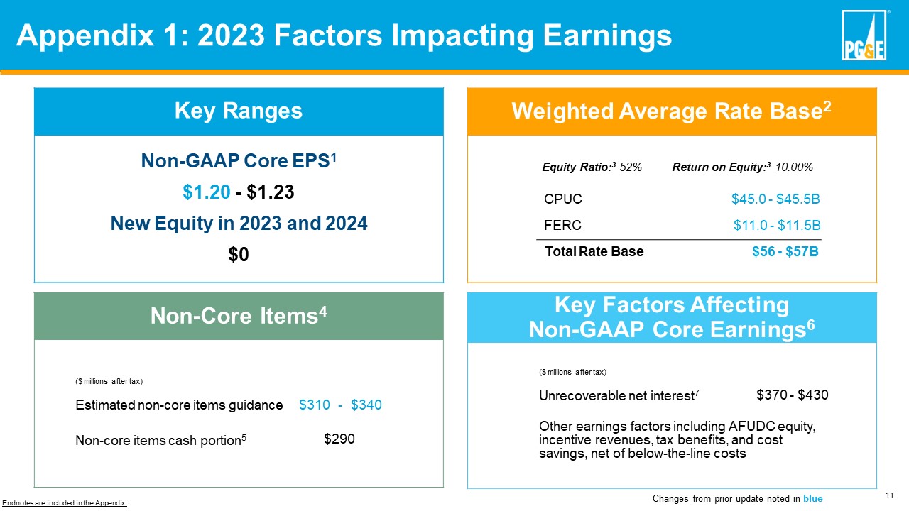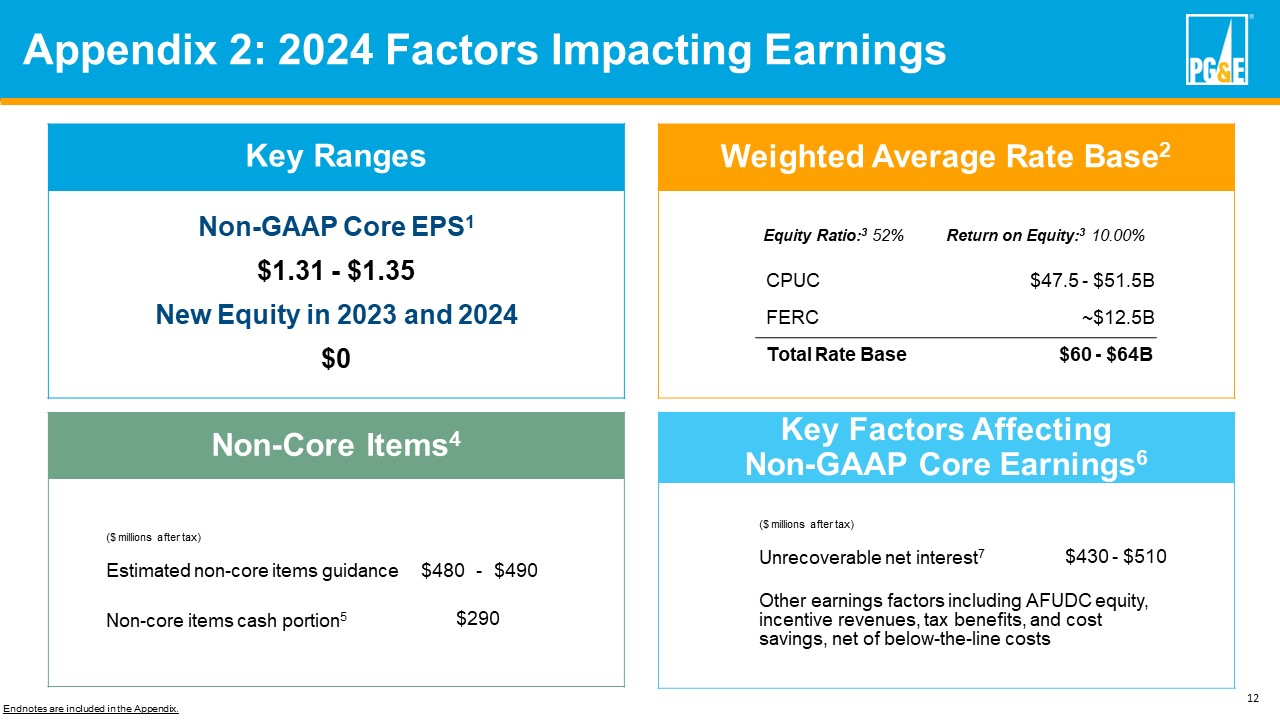 11 Endnotes are included in the Appendix. Non - Core Items 4 Key Factors Affecting Non - GAAP Core Earnings 6 ($ millions after tax) $ 370 - $ 430 Unrecoverable net interest 7 Other earnings factors including AFUDC equity , incentive revenues, tax benefits, and cost savings, net of below - the - line costs Weighted Average Rate Base 2 ($ millions after tax) $ 340 - $ 310 Estimated non - core items guidance $ 29 0 Non - core items cash portion 5 $45.0 - $45.5B CPUC $11.0 - $11.5B FERC $ 56 - $57B Total Rate Base Equity Ratio: 3 52% Return on Equity: 3 10.00 % Key Ranges Non - GAAP Core EPS 1 $1.20 - $1.23 New Equity in 2023 and 2024 $0 Appendix 1: 2023 Factors Impacting Earnings Changes from prior update noted in blue