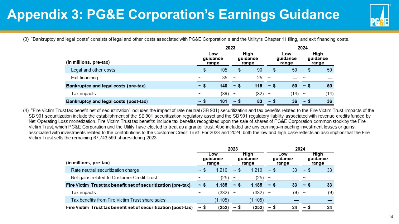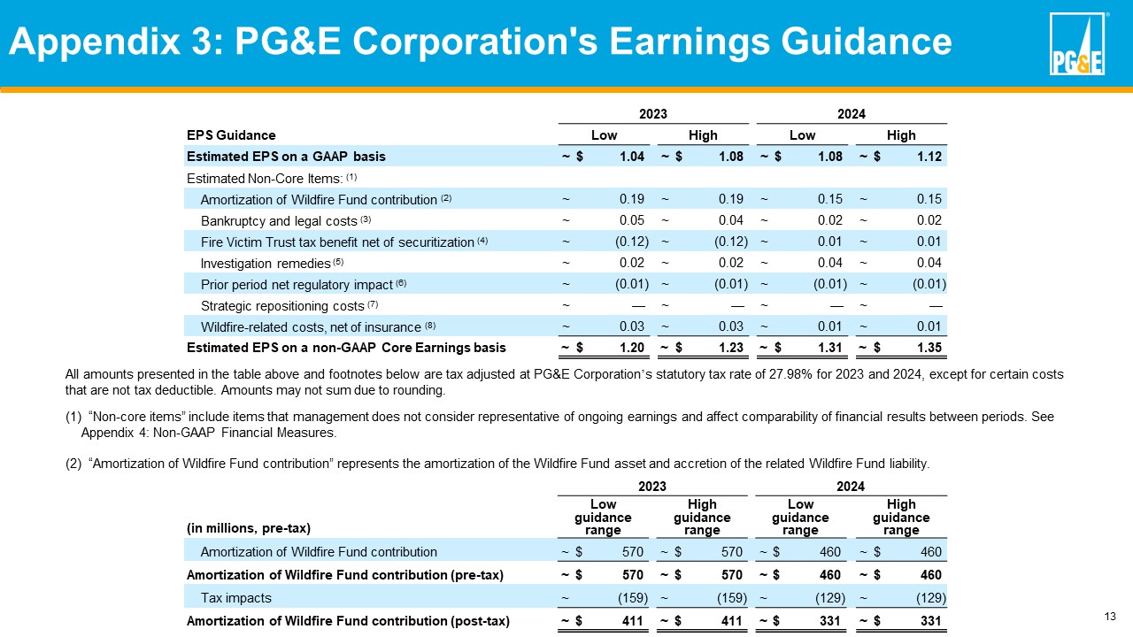 13 All amounts presented in the table above and footnotes below are tax adjusted at PG&E Corporation ’ s statutory tax rate of 27.98% for 2023 and 2024 , except for certain costs that are not tax deductible. Amounts may not sum due to rounding. (1) “Non - core items” include items that management does not consider representative of ongoing earnings and affect comparabilit y of financial results between periods. See Appendix 4 : Non - GAAP Financial Measures. (2) “Amortization of Wildfire Fund contribution” represents the amortization of the Wildfire Fund asset and accretion of the re lated Wildfire Fund liability. Appendix 3: PG&E Corporation's Earnings Guidance 2024 2023 High Low High Low EPS Guidance $ 1.12 ~ $ 1.08 ~ $ 1.08 ~ $ 1.04 ~ Estimated EPS on a GAAP basis Estimated Non - Core Items: (1) 0.15 ~ 0.15 ~ 0.19 ~ 0.19 ~ Amortization of Wildfire Fund contribution (2) 0.02 ~ 0.02 ~ 0.04 ~ 0.05 ~ Bankruptcy and legal costs (3) 0.01 ~ 0.01 ~ (0.12) ~ (0.12) ~ Fire Victim Trust tax benefit net of securitization (4) 0.04 ~ 0.04 ~ 0.02 ~ 0.02 ~ Investigation remedies (5) (0.01) ~ (0.01) ~ (0.01) ~ (0.01) ~ Prior period net regulatory impact (6) — ~ — ~ — ~ — ~ Strategic repositioning costs (7) 0.01 ~ 0.01 ~ 0.03 ~ 0.03 ~ Wildfire - related costs, net of insurance (8) $ 1.35 ~ $ 1.31 ~ $ 1.23 ~ $ 1.20 ~ Estimated EPS on a non - GAAP Core Earnings basis 2024 2023 High guidance range Low guidance range High guidance range Low guidance range (in millions, pre - tax) $ 460 ~ $ 460 ~ $ 570 ~ $ 570 ~ Amortization of Wildfire Fund contribution $ 460 ~ $ 460 ~ $ 570 ~ $ 570 ~ Amortization of Wildfire Fund contribution (pre - tax) (129) ~ (129) ~ (159) ~ (159) ~ Tax impacts $ 331 ~ $ 331 ~ $ 411 ~ $ 411 ~ Amortization of Wildfire Fund contribution (post - tax)