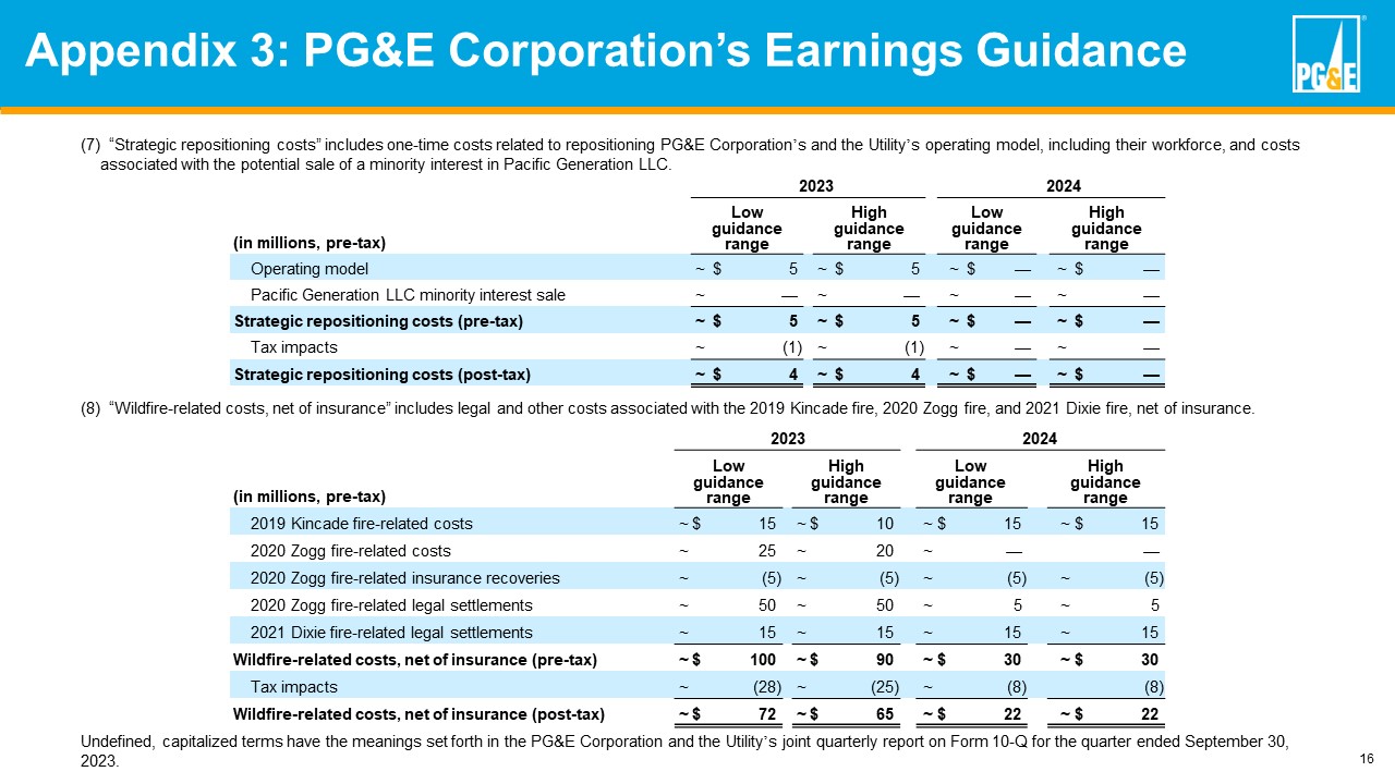 16 (7) “Strategic repositioning costs” includes one - time costs related to repositioning PG&E Corporation ’ s and the Utility ’ s operating model, including their workforce, and costs associated with the potential sale of a minority interest in Pacific Generation LLC. Undefined, capitalized terms have the meanings set forth in the PG&E Corporation and the Utility ’ s joint quarterly report on Form 10 - Q for the quarter ended September 30, 2023. (8) “Wildfire - related costs, net of insurance” includes legal and other costs associated with the 2019 Kincade fire, 2020 Zogg fire, and 2021 Dixie fire, net of insurance. Appendix 3: PG&E Corporation’s Earnings Guidance 2024 2023 High guidance range Low guidance range High guidance range Low guidance range (in millions, pre - tax) $ — ~ $ — ~ $ 5 ~ $ 5 ~ Operating model — ~ — ~ — ~ — ~ Pacific Generation LLC minority interest sale $ — ~ $ — ~ $ 5 ~ $ 5 ~ Strategic repositioning costs (pre - tax) — ~ — ~ (1) ~ (1) ~ Tax impacts $ — ~ $ — ~ $ 4 ~ $ 4 ~ Strategic repositioning costs (post - tax) 2024 2023 High guidance range Low guidance range High guidance range Low guidance range (in millions, pre - tax) $ 15 ~ $ 15 ~ $ 10 ~ $ 15 ~ 2019 Kincade fire - related costs — — ~ 20 ~ 25 ~ 2020 Zogg fire - related costs (5) ~ (5) ~ (5) ~ (5) ~ 2020 Zogg fire - related insurance recoveries 5 ~ 5 ~ 50 ~ 50 ~ 2020 Zogg fire - related legal settlements 15 ~ 15 ~ 15 ~ 15 ~ 2021 Dixie fire - related legal settlements $ 30 ~ $ 30 ~ $ 90 ~ $ 100 ~ Wildfire - related costs, net of insurance (pre - tax) (8) (8) ~ (25) ~ (28) ~ Tax impacts $ 22 ~ $ 22 ~ $ 65 ~ $ 72 ~ Wildfire - related costs, net of insurance (post - tax)