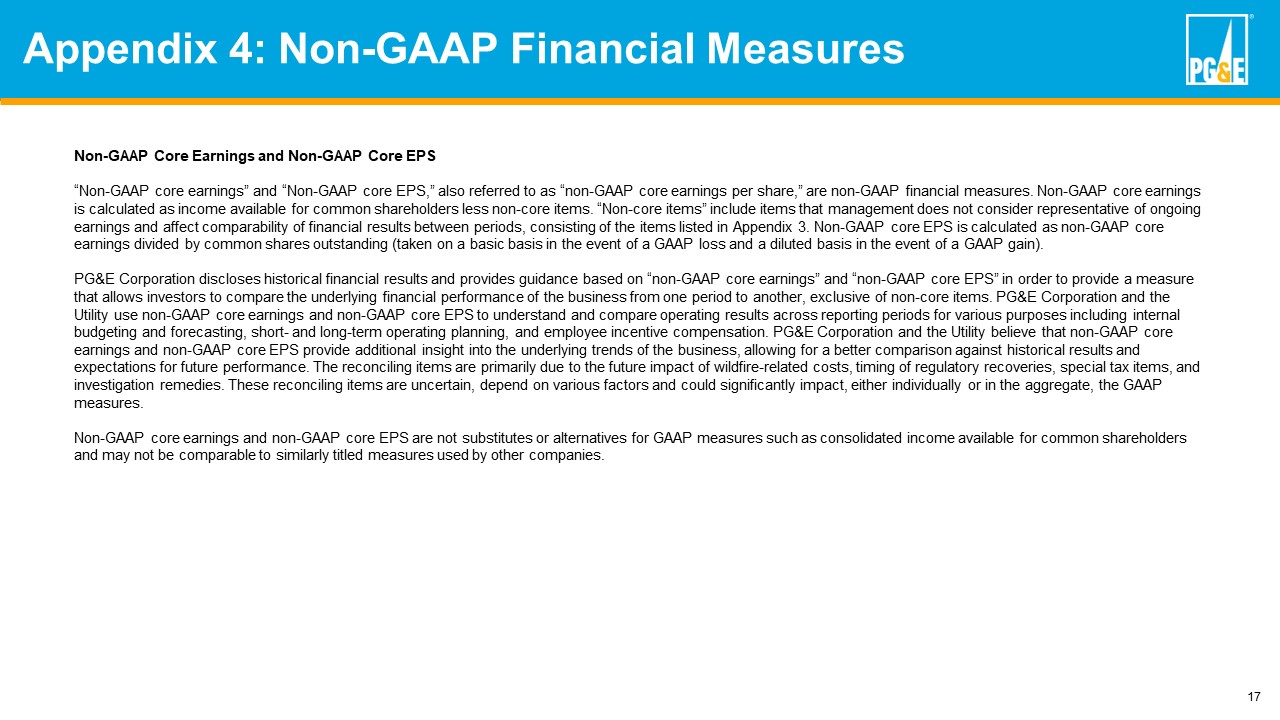 17 Non - GAAP Core Earnings and Non - GAAP Core EPS “Non - GAAP core earnings” and “Non - GAAP core EPS,” also referred to as “non - GAAP core earnings per share,” are non - GAAP financial measures. Non - GAAP core earnings is calculated as income available for common shareholders less non - core items. “Non - core items” include items that management do es not consider representative of ongoing earnings and affect comparability of financial results between periods, consisting of the items listed in Appendix 3 . Non - GAAP core EPS is calculated as non - GAAP core earnings divided by common shares outstanding (taken on a basic basis in the event of a GAAP loss and a diluted basis in the eve nt of a GAAP gain). PG&E Corporation discloses historical financial results and provides guidance based on “non - GAAP core earnings” and “non - GAAP co re EPS” in order to provide a measure that allows investors to compare the underlying financial performance of the business from one period to another, exclusive o f n on - core items. PG&E Corporation and the Utility use non - GAAP core earnings and non - GAAP core EPS to understand and compare operating results across reporting periods fo r various purposes including internal budgeting and forecasting, short - and long - term operating planning, and employee incentive compensation. PG&E Corporation and th e Utility believe that non - GAAP core earnings and non - GAAP core EPS provide additional insight into the underlying trends of the business, allowing for a better comp arison against historical results and expectations for future performance. The reconciling items are primarily due to the future impact of wildfire - related costs, timing of regulatory recoveries, special tax items, and investigation remedies. These reconciling items are uncertain, depend on various factors and could significantly impact, eith er individually or in the aggregate, the GAAP measures. Non - GAAP core earnings and non - GAAP core EPS are not substitutes or alternatives for GAAP measures such as consolidated income a vailable for common shareholders and may not be comparable to similarly titled measures used by other companies. Appendix 4: Non - GAAP Financial Measures