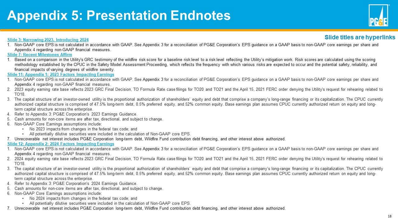 18 Slide titles are hyperlinks Slide 3: Narrowing 2023, Introducing 2024 1. Non - GAAP core EPS is not calculated in accordance with GAAP. See Appendix 3 for a reconciliation of PG&E Corporation’s EPS guida nce on a GAAP basis to non - GAAP core earnings per share and Appendix 4 regarding non - GAAP financial measures. Slide 7: Recent Milestones Affirm 1. Based on a comparison in the Utility's GRC testimony of the wildfire risk score for a baseline risk level to a risk level ref lec ting the Utility’s mitigation work. Risk scores are calculated using the scoring methodology established by the CPUC in the Safety Model Assessment Proceeding, which reflects the frequency with which variou s r isks are expected to occur and the potential safety, reliability, and financial impacts of varying degrees of wildfire severity. Slide 11: Appendix 1: 2023 Factors Impacting Earnings 1. Non - GAAP core EPS is not calculated in accordance with GAAP. See Appendix 3 for a reconciliation of PG&E Corporation’s EPS guidance on a GAAP basis to non - GAAP core earnings per share and Appendix 4 regarding non - GAAP financial measures. 2. 2023 equity earning rate base reflects 2023 GRC Final Decision, TO Formula Rate case filings for TO20 and TO21 and the April 15, 2021 FERC order denying the Utility's request for rehearing related to TO18. 3. The capital structure of an investor - owned utility is the proportional authorization of shareholders’ equity and debt that compr ise a company’s long - range financing or its capitalization. The CPUC currently authorized capital structure is comprised of 47.5% long - term debt, 0.5% preferred equity, and 52% common equity. Base earnings p lan assumes CPUC currently authorized return on equity and long - term capital structure across the enterprise. 4. Refer to Appendix 3: PG&E Corporation's 2023 Earnings Guidance. 5. Cash amounts for non - core items are after tax, directional, and subject to change. 6. Non - GAAP Core Earnings assumptions include: • No 2023 impacts from changes in the federal tax code; and • All potentially dilutive securities were included in the calculation of Non - GAAP core EPS. 7. Unrecoverable net interest includes PG&E Corporation long - term debt, Wildfire Fund contribution debt financing, and other intere st above authorized . Slide 12: Appendix 2: 2024 Factors Impacting Earnings 1. Non - GAAP core EPS is not calculated in accordance with GAAP. See Appendix 3 for a reconciliation of PG&E Corporation’s EPS guidance on a GAAP basis to non - GAAP core earnings per share and Appendix 4 regarding non - GAAP financial measures. 2. 2024 equity earning rate base reflects 2023 GRC Final Decision, TO Formula Rate case filings for TO20 and TO21 and the April 15, 2021 FERC order denying the Utility's request for rehearing rel ated to TO18 . 3. The capital structure of an investor - owned utility is the proportional authorization of shareholders’ equity and debt that compr ise a company’s long - range financing or its capitalization. The CPUC currently authorized capital structure is comprised of 47.5% long - term debt, 0.5% preferred equity, and 52% common equity. Base earnings p lan assumes CPUC currently authorized return on equity and long - term capital structure across the enterprise. 4. Refer to Appendix 3: PG&E Corporation's 2024 Earnings Guidance. 5. Cash amounts for non - core items are after tax, directional, and subject to change. 6. Non - GAAP Core Earnings assumptions include: • No 2024 impacts from changes in the federal tax code; and • All potentially dilutive securities were included in the calculation of Non - GAAP core EPS. 7. Unrecoverable net interest includes PG&E Corporation long - term debt, Wildfire Fund contribution debt financing, and other intere st above authorized . Appendix 5: Presentation Endnotes