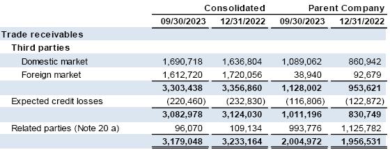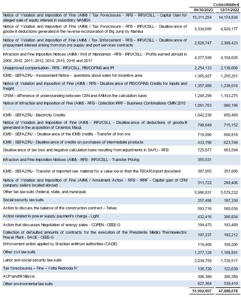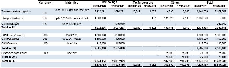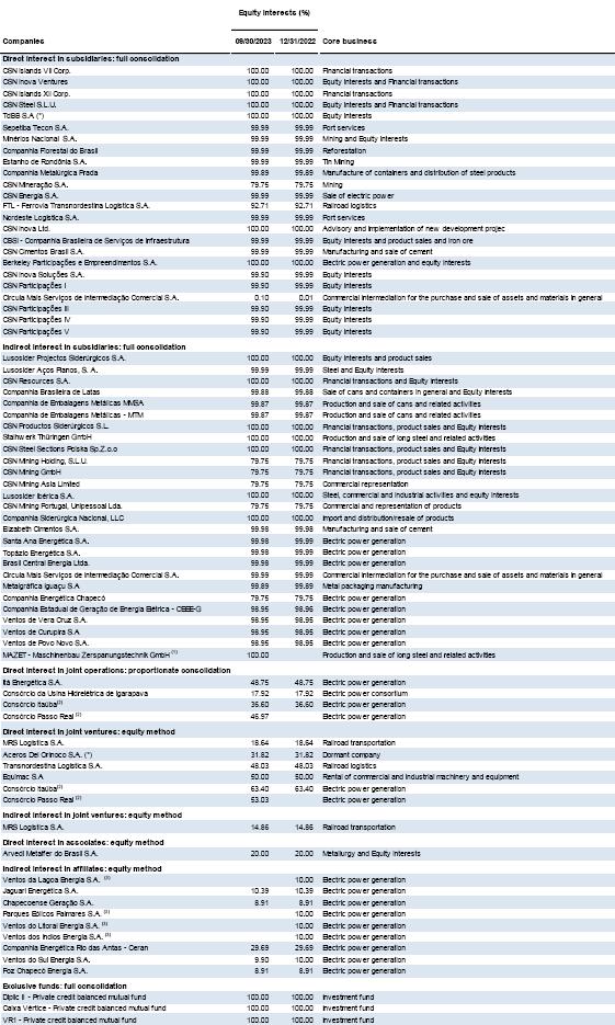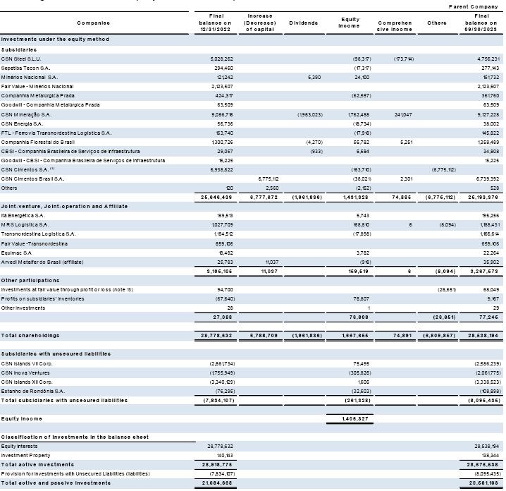 | (3) | Dividends receivable: In the Parent Company on September 30, 2023, it mainly refers to interest on equity from Minérios Nacional S.A in the amount of R$9,353 (R$14,785 in December 2022) and dividends from the subsidiary CSN Cimentos Brasil S.A in the amount of R$178,348 on September 30, 2023 (R$178,348 on December 31, 2022) and in the Consolidated dividends from MRS Logística S.A in the amount of R$77,377 (R$77,377 in December 2022); |
