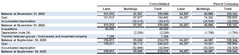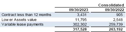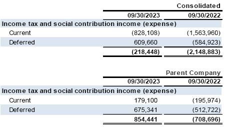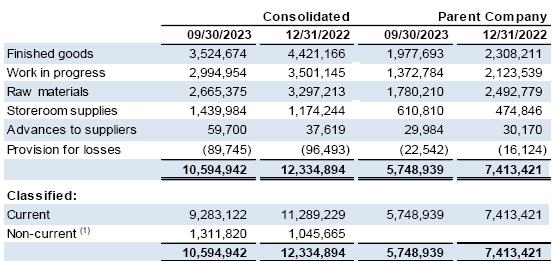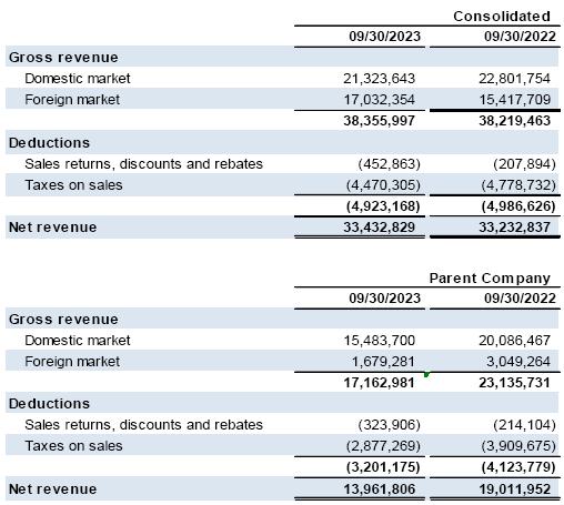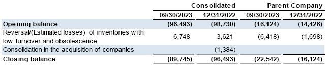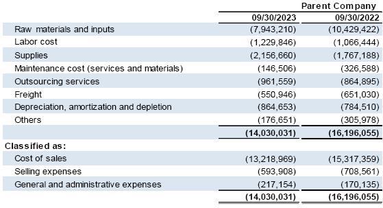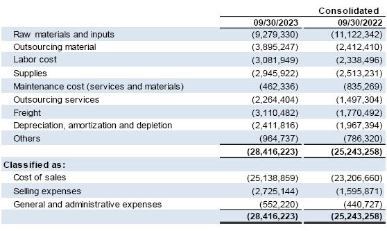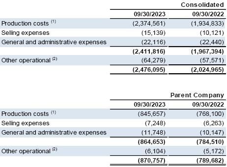 (1) The cost of production includes PIS and COFINS credits on lease agreements as of September 30, 2023, in the amount of R$5,782 in the consolidated (R$5,426 as of September 30, 2022) and R$620 in the parent company (R$458 as of September 30, 2022);