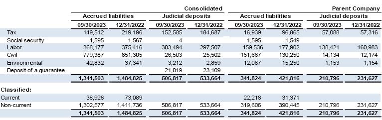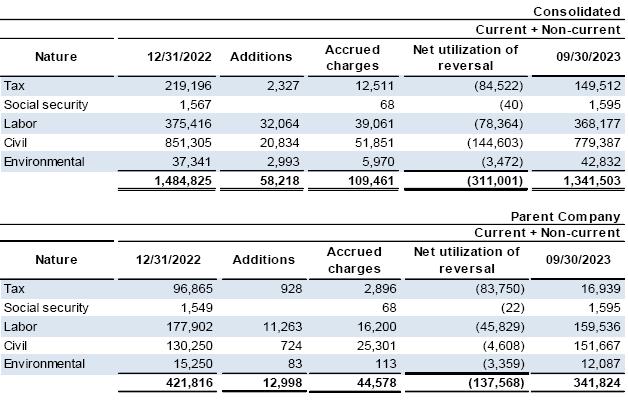 The changes in tax, social security, labor, civil and environmental provisions in the period ended September 30, 2023 can be summarized as follows: