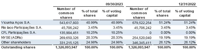 As of March 31, 2023, an Asset Restructuring Agreement was entered into between Rio Purus Participações S.A. and CFL Participações S.A. ("CFL"), the shareholders that directly and indirectly hold all the shares of Vicunha Aços S.A. ("Vicunha Aços"). Thus, the implementation of this Transaction results in CFL Ana Participações S.A. ("CFL Ana"), a subsidiary of CFL, holding 135,904,451 common shares, book-entry and without par value issued by CSN, representing on this date 10.25% of its capital stock.