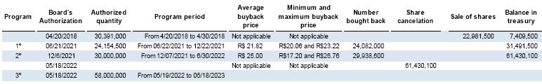 On September 30, 2023, the Company did not have an open treasury share buyback program, below is the movement of the programs that were closed: