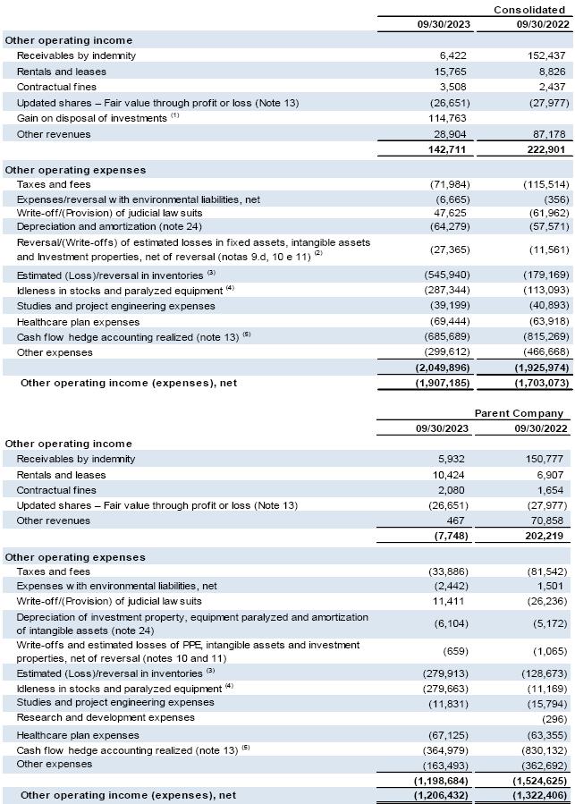 | (3) | In the Parent Company, refers substantially to losses incurred in the production process at the Presidente Vargas Plant ("UPV") and in Consolidated, losses in inventories in the amount of (R$213,490); |