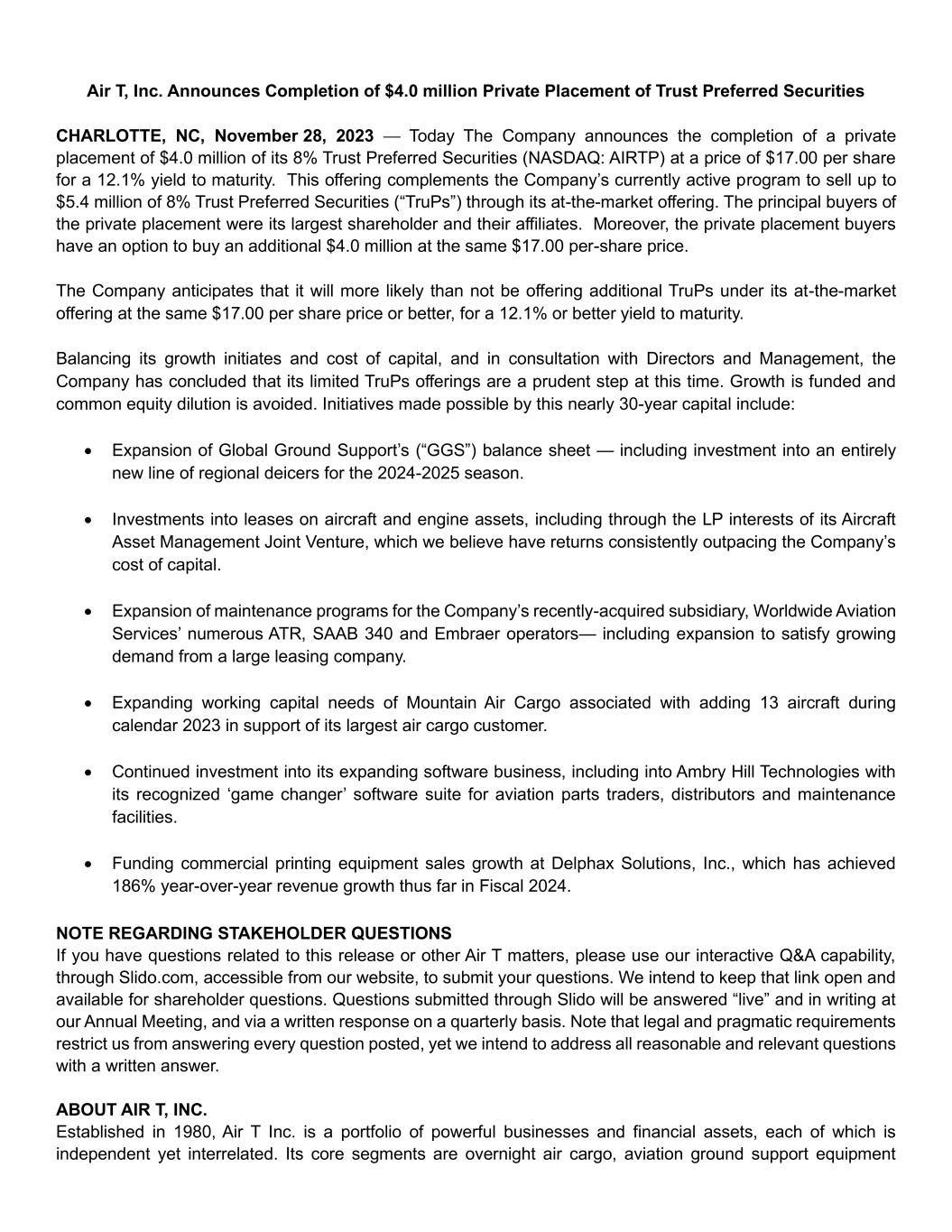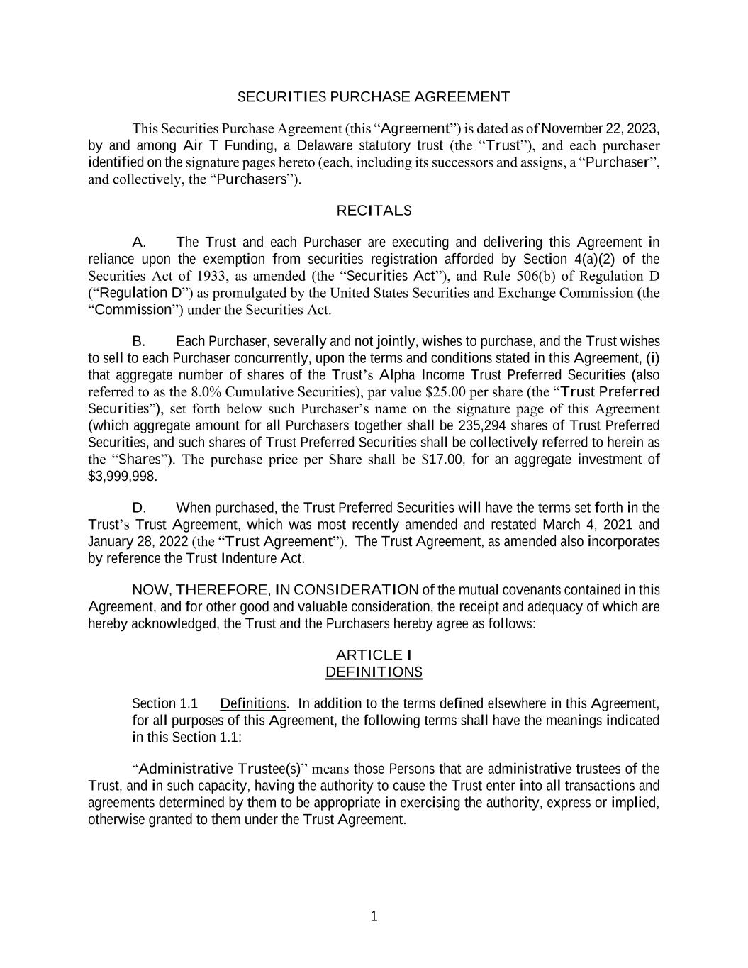 1 SECURITIES PURCHASE AGREEMENT This Securities Purchase Agreement (this “Agreement”) is dated as of November 22, 2023, by and among Air T Funding, a Delaware statutory trust (the “Trust”), and each purchaser identified on the signature pages hereto (each, including its successors and assigns, a “Purchaser”, and collectively, the “Purchasers”). RECITALS A. The Trust and each Purchaser are executing and delivering this Agreement in reliance upon the exemption from securities registration afforded by Section 4(a)(2) of the Securities Act of 1933, as amended (the “Securities Act”), and Rule 506(b) of Regulation D (“Regulation D”) as promulgated by the United States Securities and Exchange Commission (the “Commission”) under the Securities Act. B. Each Purchaser, severally and not jointly, wishes to purchase, and the Trust wishes to sell to each Purchaser concurrently, upon the terms and conditions stated in this Agreement, (i) that aggregate number of shares of the Trust’s Alpha Income Trust Preferred Securities (also referred to as the 8.0% Cumulative Securities), par value $25.00 per share (the “Trust Preferred Securities”), set forth below such Purchaser’s name on the signature page of this Agreement (which aggregate amount for all Purchasers together shall be 235,294 shares of Trust Preferred Securities, and such shares of Trust Preferred Securities shall be collectively referred to herein as the “Shares”). The purchase price per Share shall be $17.00, for an aggregate investment of $3,999,998. D. When purchased, the Trust Preferred Securities will have the terms set forth in the Trust’s Trust Agreement, which was most recently amended and restated March 4, 2021 and January 28, 2022 (the “Trust Agreement”). The Trust Agreement, as amended also incorporates by reference the Trust Indenture Act. NOW, THEREFORE, IN CONSIDERATION of the mutual covenants contained in this Agreement, and for other good and valuable consideration, the receipt and adequacy of which are hereby acknowledged, the Trust and the Purchasers hereby agree as follows: ARTICLE I DEFINITIONS Section 1.1 Definitions. In addition to the terms defined elsewhere in this Agreement, for all purposes of this Agreement, the following terms shall have the meanings indicated in this Section 1.1: “Administrative Trustee(s)” means those Persons that are administrative trustees of the Trust, and in such capacity, having the authority to cause the Trust enter into all transactions and agreements determined by them to be appropriate in exercising the authority, express or implied, otherwise granted to them under the Trust Agreement.
