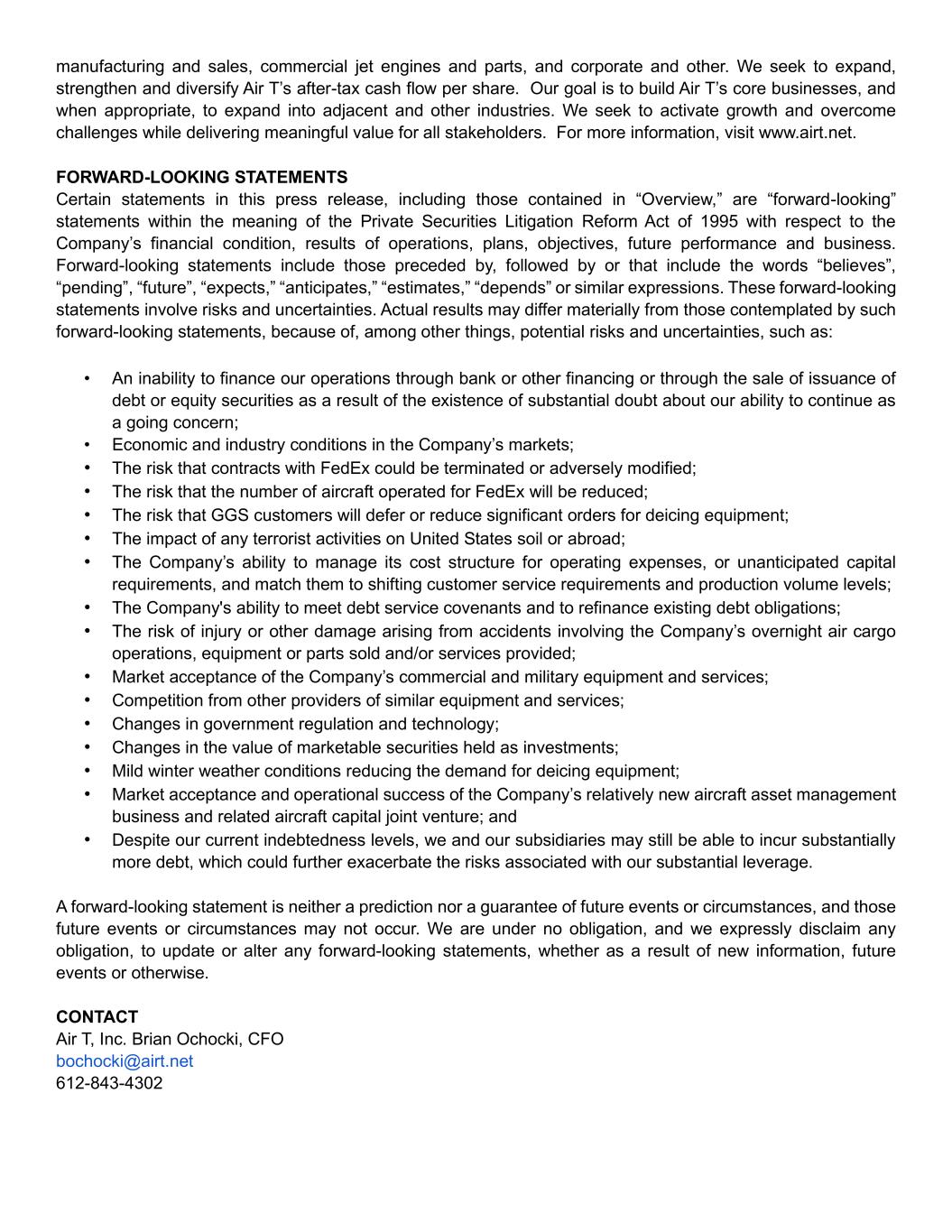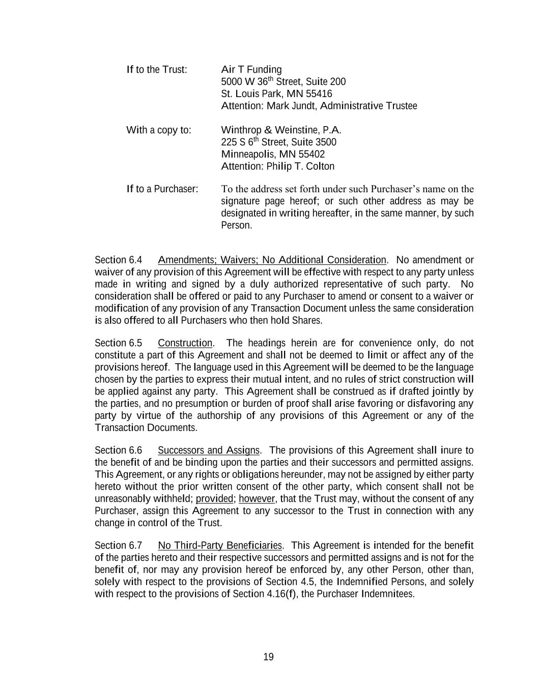 19 If to the Trust: Air T Funding 5000 W 36th Street, Suite 200 St. Louis Park, MN 55416 Attention: Mark Jundt, Administrative Trustee With a copy to: Winthrop & Weinstine, P.A. 225 S 6th Street, Suite 3500 Minneapolis, MN 55402 Attention: Philip T. Colton If to a Purchaser: To the address set forth under such Purchaser’s name on the signature page hereof; or such other address as may be designated in writing hereafter, in the same manner, by such Person. Section 6.4 Amendments; Waivers; No Additional Consideration. No amendment or waiver of any provision of this Agreement will be effective with respect to any party unless made in writing and signed by a duly authorized representative of such party. No consideration shall be offered or paid to any Purchaser to amend or consent to a waiver or modification of any provision of any Transaction Document unless the same consideration is also offered to all Purchasers who then hold Shares. Section 6.5 Construction. The headings herein are for convenience only, do not constitute a part of this Agreement and shall not be deemed to limit or affect any of the provisions hereof. The language used in this Agreement will be deemed to be the language chosen by the parties to express their mutual intent, and no rules of strict construction will be applied against any party. This Agreement shall be construed as if drafted jointly by the parties, and no presumption or burden of proof shall arise favoring or disfavoring any party by virtue of the authorship of any provisions of this Agreement or any of the Transaction Documents. Section 6.6 Successors and Assigns. The provisions of this Agreement shall inure to the benefit of and be binding upon the parties and their successors and permitted assigns. This Agreement, or any rights or obligations hereunder, may not be assigned by either party hereto without the prior written consent of the other party, which consent shall not be unreasonably withheld; provided; however, that the Trust may, without the consent of any Purchaser, assign this Agreement to any successor to the Trust in connection with any change in control of the Trust. Section 6.7 No Third-Party Beneficiaries. This Agreement is intended for the benefit of the parties hereto and their respective successors and permitted assigns and is not for the benefit of, nor may any provision hereof be enforced by, any other Person, other than, solely with respect to the provisions of Section 4.5, the Indemnified Persons, and solely with respect to the provisions of Section 4.16(f), the Purchaser Indemnitees.