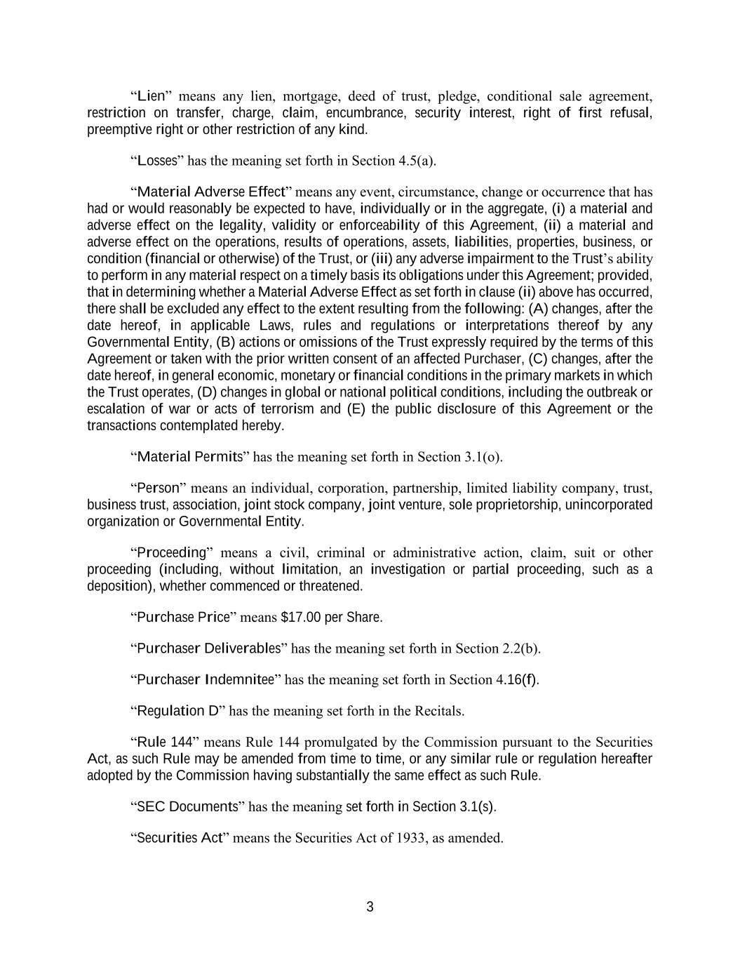 3 “Lien” means any lien, mortgage, deed of trust, pledge, conditional sale agreement, restriction on transfer, charge, claim, encumbrance, security interest, right of first refusal, preemptive right or other restriction of any kind. “Losses” has the meaning set forth in Section 4.5(a). “Material Adverse Effect” means any event, circumstance, change or occurrence that has had or would reasonably be expected to have, individually or in the aggregate, (i) a material and adverse effect on the legality, validity or enforceability of this Agreement, (ii) a material and adverse effect on the operations, results of operations, assets, liabilities, properties, business, or condition (financial or otherwise) of the Trust, or (iii) any adverse impairment to the Trust’s ability to perform in any material respect on a timely basis its obligations under this Agreement; provided, that in determining whether a Material Adverse Effect as set forth in clause (ii) above has occurred, there shall be excluded any effect to the extent resulting from the following: (A) changes, after the date hereof, in applicable Laws, rules and regulations or interpretations thereof by any Governmental Entity, (B) actions or omissions of the Trust expressly required by the terms of this Agreement or taken with the prior written consent of an affected Purchaser, (C) changes, after the date hereof, in general economic, monetary or financial conditions in the primary markets in which the Trust operates, (D) changes in global or national political conditions, including the outbreak or escalation of war or acts of terrorism and (E) the public disclosure of this Agreement or the transactions contemplated hereby. “Material Permits” has the meaning set forth in Section 3.1(o). “Person” means an individual, corporation, partnership, limited liability company, trust, business trust, association, joint stock company, joint venture, sole proprietorship, unincorporated organization or Governmental Entity. “Proceeding” means a civil, criminal or administrative action, claim, suit or other proceeding (including, without limitation, an investigation or partial proceeding, such as a deposition), whether commenced or threatened. “Purchase Price” means $17.00 per Share. “Purchaser Deliverables” has the meaning set forth in Section 2.2(b). “Purchaser Indemnitee” has the meaning set forth in Section 4.16(f). “Regulation D” has the meaning set forth in the Recitals. “Rule 144” means Rule 144 promulgated by the Commission pursuant to the Securities Act, as such Rule may be amended from time to time, or any similar rule or regulation hereafter adopted by the Commission having substantially the same effect as such Rule. “SEC Documents” has the meaning set forth in Section 3.1(s). “Securities Act” means the Securities Act of 1933, as amended.