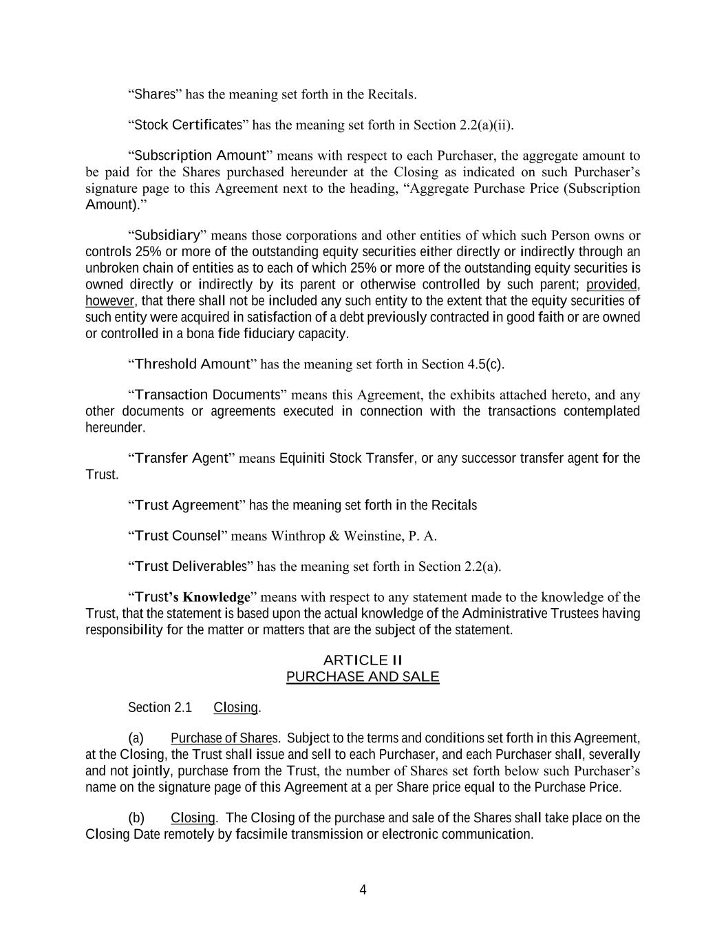 4 “Shares” has the meaning set forth in the Recitals. “Stock Certificates” has the meaning set forth in Section 2.2(a)(ii). “Subscription Amount” means with respect to each Purchaser, the aggregate amount to be paid for the Shares purchased hereunder at the Closing as indicated on such Purchaser’s signature page to this Agreement next to the heading, “Aggregate Purchase Price (Subscription Amount).” “Subsidiary” means those corporations and other entities of which such Person owns or controls 25% or more of the outstanding equity securities either directly or indirectly through an unbroken chain of entities as to each of which 25% or more of the outstanding equity securities is owned directly or indirectly by its parent or otherwise controlled by such parent; provided, however, that there shall not be included any such entity to the extent that the equity securities of such entity were acquired in satisfaction of a debt previously contracted in good faith or are owned or controlled in a bona fide fiduciary capacity. “Threshold Amount” has the meaning set forth in Section 4.5(c). “Transaction Documents” means this Agreement, the exhibits attached hereto, and any other documents or agreements executed in connection with the transactions contemplated hereunder. “Transfer Agent” means Equiniti Stock Transfer, or any successor transfer agent for the Trust. “Trust Agreement” has the meaning set forth in the Recitals “Trust Counsel” means Winthrop & Weinstine, P. A. “Trust Deliverables” has the meaning set forth in Section 2.2(a). “Trust’s Knowledge” means with respect to any statement made to the knowledge of the Trust, that the statement is based upon the actual knowledge of the Administrative Trustees having responsibility for the matter or matters that are the subject of the statement. ARTICLE II PURCHASE AND SALE Section 2.1 Closing. (a) Purchase of Shares. Subject to the terms and conditions set forth in this Agreement, at the Closing, the Trust shall issue and sell to each Purchaser, and each Purchaser shall, severally and not jointly, purchase from the Trust, the number of Shares set forth below such Purchaser’s name on the signature page of this Agreement at a per Share price equal to the Purchase Price. (b) Closing. The Closing of the purchase and sale of the Shares shall take place on the Closing Date remotely by facsimile transmission or electronic communication.