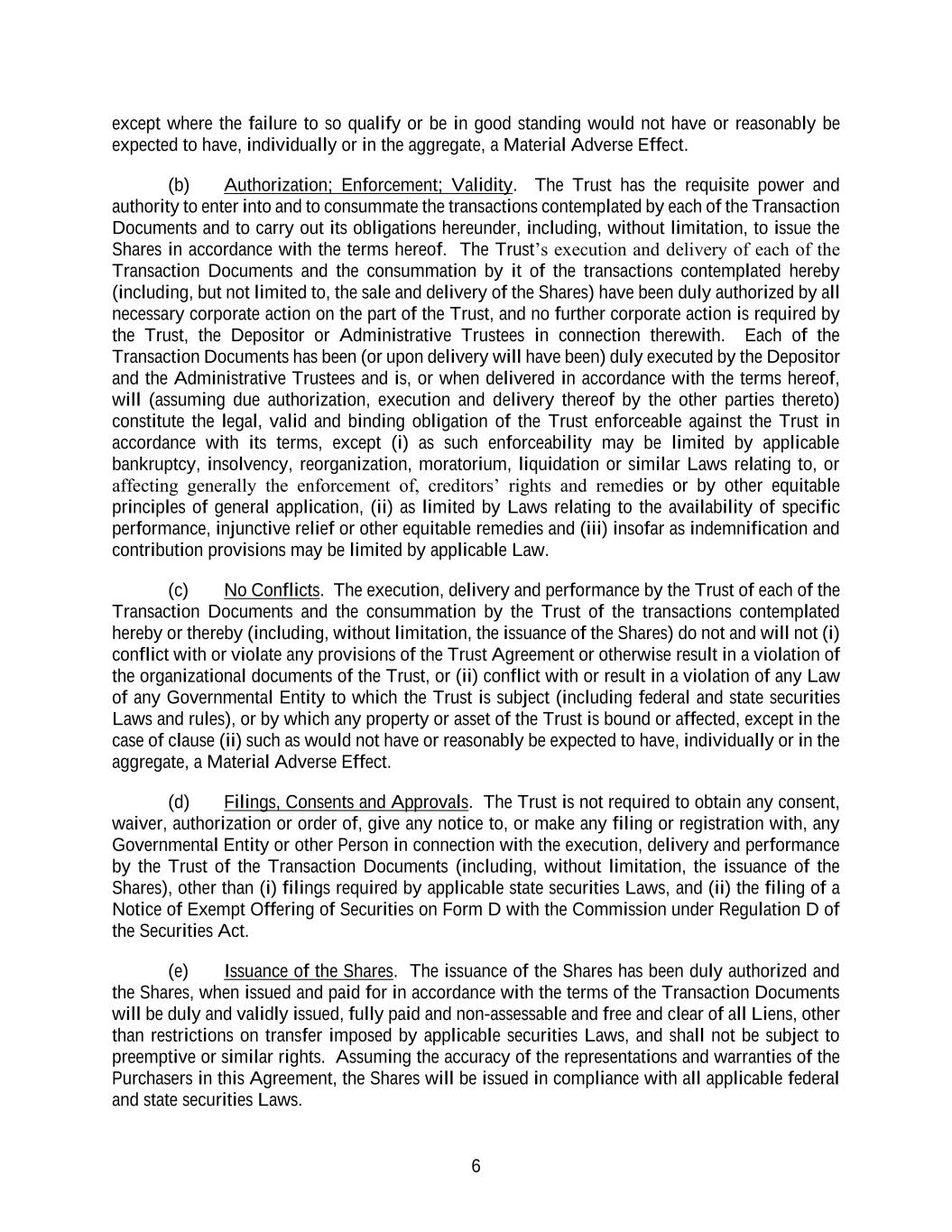 6 except where the failure to so qualify or be in good standing would not have or reasonably be expected to have, individually or in the aggregate, a Material Adverse Effect. (b) Authorization; Enforcement; Validity. The Trust has the requisite power and authority to enter into and to consummate the transactions contemplated by each of the Transaction Documents and to carry out its obligations hereunder, including, without limitation, to issue the Shares in accordance with the terms hereof. The Trust’s execution and delivery of each of the Transaction Documents and the consummation by it of the transactions contemplated hereby (including, but not limited to, the sale and delivery of the Shares) have been duly authorized by all necessary corporate action on the part of the Trust, and no further corporate action is required by the Trust, the Depositor or Administrative Trustees in connection therewith. Each of the Transaction Documents has been (or upon delivery will have been) duly executed by the Depositor and the Administrative Trustees and is, or when delivered in accordance with the terms hereof, will (assuming due authorization, execution and delivery thereof by the other parties thereto) constitute the legal, valid and binding obligation of the Trust enforceable against the Trust in accordance with its terms, except (i) as such enforceability may be limited by applicable bankruptcy, insolvency, reorganization, moratorium, liquidation or similar Laws relating to, or affecting generally the enforcement of, creditors’ rights and remedies or by other equitable principles of general application, (ii) as limited by Laws relating to the availability of specific performance, injunctive relief or other equitable remedies and (iii) insofar as indemnification and contribution provisions may be limited by applicable Law. (c) No Conflicts. The execution, delivery and performance by the Trust of each of the Transaction Documents and the consummation by the Trust of the transactions contemplated hereby or thereby (including, without limitation, the issuance of the Shares) do not and will not (i) conflict with or violate any provisions of the Trust Agreement or otherwise result in a violation of the organizational documents of the Trust, or (ii) conflict with or result in a violation of any Law of any Governmental Entity to which the Trust is subject (including federal and state securities Laws and rules), or by which any property or asset of the Trust is bound or affected, except in the case of clause (ii) such as would not have or reasonably be expected to have, individually or in the aggregate, a Material Adverse Effect. (d) Filings, Consents and Approvals. The Trust is not required to obtain any consent, waiver, authorization or order of, give any notice to, or make any filing or registration with, any Governmental Entity or other Person in connection with the execution, delivery and performance by the Trust of the Transaction Documents (including, without limitation, the issuance of the Shares), other than (i) filings required by applicable state securities Laws, and (ii) the filing of a Notice of Exempt Offering of Securities on Form D with the Commission under Regulation D of the Securities Act. (e) Issuance of the Shares. The issuance of the Shares has been duly authorized and the Shares, when issued and paid for in accordance with the terms of the Transaction Documents will be duly and validly issued, fully paid and non-assessable and free and clear of all Liens, other than restrictions on transfer imposed by applicable securities Laws, and shall not be subject to preemptive or similar rights. Assuming the accuracy of the representations and warranties of the Purchasers in this Agreement, the Shares will be issued in compliance with all applicable federal and state securities Laws.