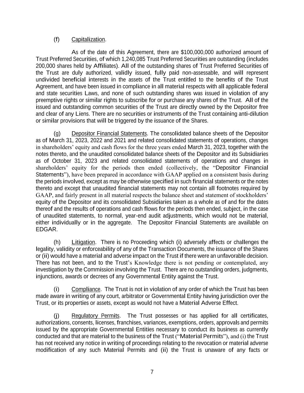 7 (f) Capitalization. As of the date of this Agreement, there are $100,000,000 authorized amount of Trust Preferred Securities, of which 1,240,085 Trust Preferred Securities are outstanding (includes 200,000 shares held by Affiliates). All of the outstanding shares of Trust Preferred Securities of the Trust are duly authorized, validly issued, fully paid non-assessable, and will represent undivided beneficial interests in the assets of the Trust entitled to the benefits of the Trust Agreement, and have been issued in compliance in all material respects with all applicable federal and state securities Laws, and none of such outstanding shares was issued in violation of any preemptive rights or similar rights to subscribe for or purchase any shares of the Trust. All of the issued and outstanding common securities of the Trust are directly owned by the Depositor free and clear of any Liens. There are no securities or instruments of the Trust containing anti-dilution or similar provisions that will be triggered by the issuance of the Shares. (g) Depositor Financial Statements. The consolidated balance sheets of the Depositor as of March 31, 2023, 2022 and 2021 and related consolidated statements of operations, changes in shareholders’ equity and cash flows for the three years ended March 31, 2023, together with the notes thereto, and the unaudited consolidated balance sheets of the Depositor and its Subsidiaries as of October 31, 2023 and related consolidated statements of operations and changes in shareholders’ equity for the periods then ended (collectively, the “Depositor Financial Statements”), have been prepared in accordance with GAAP applied on a consistent basis during the periods involved, except as may be otherwise specified in such financial statements or the notes thereto and except that unaudited financial statements may not contain all footnotes required by GAAP, and fairly present in all material respects the balance sheet and statement of stockholders’ equity of the Depositor and its consolidated Subsidiaries taken as a whole as of and for the dates thereof and the results of operations and cash flows for the periods then ended, subject, in the case of unaudited statements, to normal, year-end audit adjustments, which would not be material, either individually or in the aggregate. The Depositor Financial Statements are available on EDGAR. (h) Litigation. There is no Proceeding which (i) adversely affects or challenges the legality, validity or enforceability of any of the Transaction Documents, the issuance of the Shares or (ii) would have a material and adverse impact on the Trust if there were an unfavorable decision. There has not been, and to the Trust’s Knowledge there is not pending or contemplated, any investigation by the Commission involving the Trust. There are no outstanding orders, judgments, injunctions, awards or decrees of any Governmental Entity against the Trust. (i) Compliance. The Trust is not in violation of any order of which the Trust has been made aware in writing of any court, arbitrator or Governmental Entity having jurisdiction over the Trust, or its properties or assets, except as would not have a Material Adverse Effect. (j) Regulatory Permits. The Trust possesses or has applied for all certificates, authorizations, consents, licenses, franchises, variances, exemptions, orders, approvals and permits issued by the appropriate Governmental Entities necessary to conduct its business as currently conducted and that are material to the business of the Trust (“Material Permits”), and (i) the Trust has not received any notice in writing of proceedings relating to the revocation or material adverse modification of any such Material Permits and (ii) the Trust is unaware of any facts or