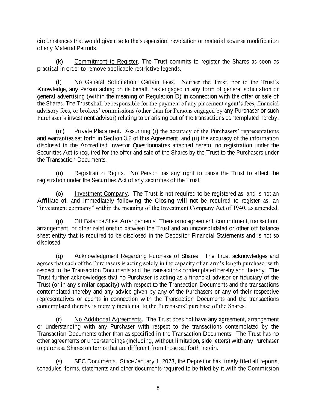 8 circumstances that would give rise to the suspension, revocation or material adverse modification of any Material Permits. (k) Commitment to Register. The Trust commits to register the Shares as soon as practical in order to remove applicable restrictive legends. (l) No General Solicitation; Certain Fees. Neither the Trust, nor to the Trust’s Knowledge, any Person acting on its behalf, has engaged in any form of general solicitation or general advertising (within the meaning of Regulation D) in connection with the offer or sale of the Shares. The Trust shall be responsible for the payment of any placement agent’s fees, financial advisory fees, or brokers’ commissions (other than for Persons engaged by any Purchaser or such Purchaser’s investment advisor) relating to or arising out of the transactions contemplated hereby. (m) Private Placement. Assuming (i) the accuracy of the Purchasers’ representations and warranties set forth in Section 3.2 of this Agreement, and (ii) the accuracy of the information disclosed in the Accredited Investor Questionnaires attached hereto, no registration under the Securities Act is required for the offer and sale of the Shares by the Trust to the Purchasers under the Transaction Documents. (n) Registration Rights. No Person has any right to cause the Trust to effect the registration under the Securities Act of any securities of the Trust. (o) Investment Company. The Trust is not required to be registered as, and is not an Affiliate of, and immediately following the Closing will not be required to register as, an “investment company” within the meaning of the Investment Company Act of 1940, as amended. (p) Off Balance Sheet Arrangements. There is no agreement, commitment, transaction, arrangement, or other relationship between the Trust and an unconsolidated or other off balance sheet entity that is required to be disclosed in the Depositor Financial Statements and is not so disclosed. (q) Acknowledgment Regarding Purchase of Shares. The Trust acknowledges and agrees that each of the Purchasers is acting solely in the capacity of an arm’s length purchaser with respect to the Transaction Documents and the transactions contemplated hereby and thereby. The Trust further acknowledges that no Purchaser is acting as a financial advisor or fiduciary of the Trust (or in any similar capacity) with respect to the Transaction Documents and the transactions contemplated thereby and any advice given by any of the Purchasers or any of their respective representatives or agents in connection with the Transaction Documents and the transactions contemplated thereby is merely incidental to the Purchasers’ purchase of the Shares. (r) No Additional Agreements. The Trust does not have any agreement, arrangement or understanding with any Purchaser with respect to the transactions contemplated by the Transaction Documents other than as specified in the Transaction Documents. The Trust has no other agreements or understandings (including, without limitation, side letters) with any Purchaser to purchase Shares on terms that are different from those set forth herein. (s) SEC Documents. Since January 1, 2023, the Depositor has timely filed all reports, schedules, forms, statements and other documents required to be filed by it with the Commission