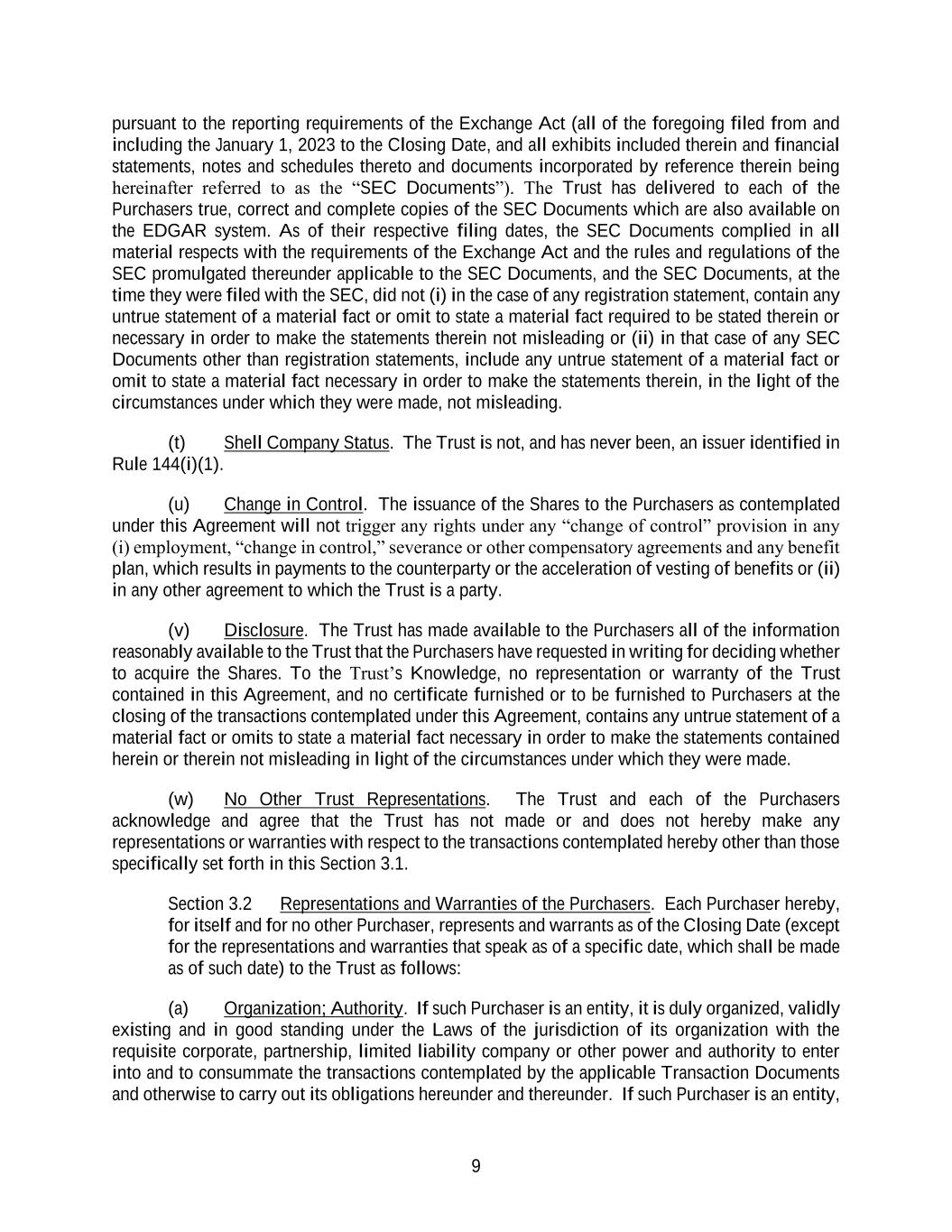 9 pursuant to the reporting requirements of the Exchange Act (all of the foregoing filed from and including the January 1, 2023 to the Closing Date, and all exhibits included therein and financial statements, notes and schedules thereto and documents incorporated by reference therein being hereinafter referred to as the “SEC Documents”). The Trust has delivered to each of the Purchasers true, correct and complete copies of the SEC Documents which are also available on the EDGAR system. As of their respective filing dates, the SEC Documents complied in all material respects with the requirements of the Exchange Act and the rules and regulations of the SEC promulgated thereunder applicable to the SEC Documents, and the SEC Documents, at the time they were filed with the SEC, did not (i) in the case of any registration statement, contain any untrue statement of a material fact or omit to state a material fact required to be stated therein or necessary in order to make the statements therein not misleading or (ii) in that case of any SEC Documents other than registration statements, include any untrue statement of a material fact or omit to state a material fact necessary in order to make the statements therein, in the light of the circumstances under which they were made, not misleading. (t) Shell Company Status. The Trust is not, and has never been, an issuer identified in Rule 144(i)(1). (u) Change in Control. The issuance of the Shares to the Purchasers as contemplated under this Agreement will not trigger any rights under any “change of control” provision in any (i) employment, “change in control,” severance or other compensatory agreements and any benefit plan, which results in payments to the counterparty or the acceleration of vesting of benefits or (ii) in any other agreement to which the Trust is a party. (v) Disclosure. The Trust has made available to the Purchasers all of the information reasonably available to the Trust that the Purchasers have requested in writing for deciding whether to acquire the Shares. To the Trust’s Knowledge, no representation or warranty of the Trust contained in this Agreement, and no certificate furnished or to be furnished to Purchasers at the closing of the transactions contemplated under this Agreement, contains any untrue statement of a material fact or omits to state a material fact necessary in order to make the statements contained herein or therein not misleading in light of the circumstances under which they were made. (w) No Other Trust Representations. The Trust and each of the Purchasers acknowledge and agree that the Trust has not made or and does not hereby make any representations or warranties with respect to the transactions contemplated hereby other than those specifically set forth in this Section 3.1. Section 3.2 Representations and Warranties of the Purchasers. Each Purchaser hereby, for itself and for no other Purchaser, represents and warrants as of the Closing Date (except for the representations and warranties that speak as of a specific date, which shall be made as of such date) to the Trust as follows: (a) Organization; Authority. If such Purchaser is an entity, it is duly organized, validly existing and in good standing under the Laws of the jurisdiction of its organization with the requisite corporate, partnership, limited liability company or other power and authority to enter into and to consummate the transactions contemplated by the applicable Transaction Documents and otherwise to carry out its obligations hereunder and thereunder. If such Purchaser is an entity,