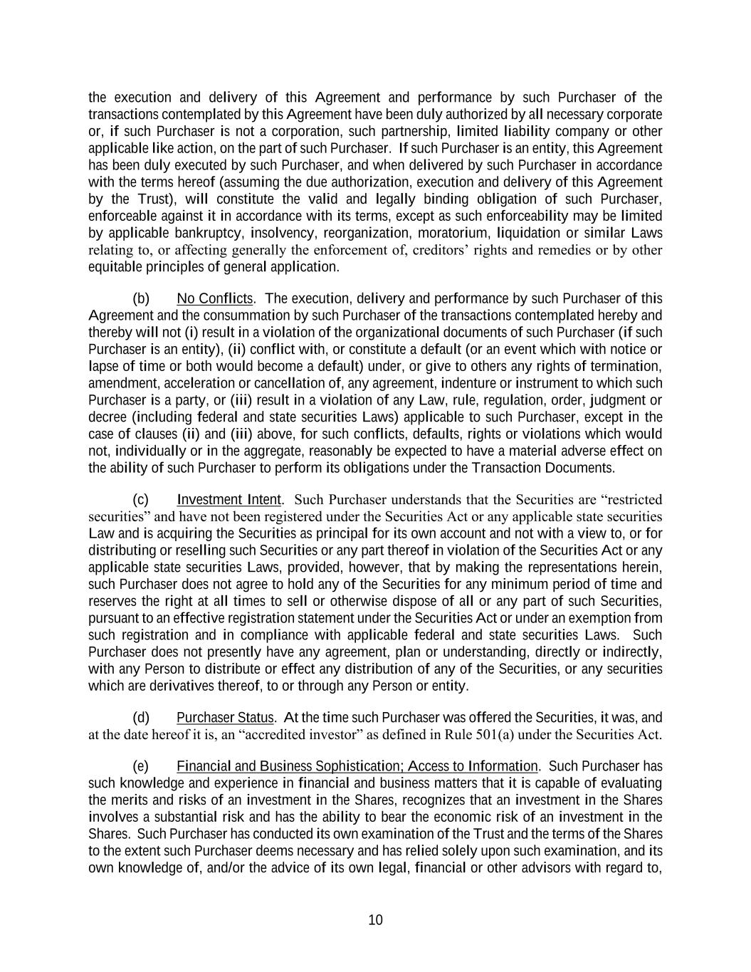 10 the execution and delivery of this Agreement and performance by such Purchaser of the transactions contemplated by this Agreement have been duly authorized by all necessary corporate or, if such Purchaser is not a corporation, such partnership, limited liability company or other applicable like action, on the part of such Purchaser. If such Purchaser is an entity, this Agreement has been duly executed by such Purchaser, and when delivered by such Purchaser in accordance with the terms hereof (assuming the due authorization, execution and delivery of this Agreement by the Trust), will constitute the valid and legally binding obligation of such Purchaser, enforceable against it in accordance with its terms, except as such enforceability may be limited by applicable bankruptcy, insolvency, reorganization, moratorium, liquidation or similar Laws relating to, or affecting generally the enforcement of, creditors’ rights and remedies or by other equitable principles of general application. (b) No Conflicts. The execution, delivery and performance by such Purchaser of this Agreement and the consummation by such Purchaser of the transactions contemplated hereby and thereby will not (i) result in a violation of the organizational documents of such Purchaser (if such Purchaser is an entity), (ii) conflict with, or constitute a default (or an event which with notice or lapse of time or both would become a default) under, or give to others any rights of termination, amendment, acceleration or cancellation of, any agreement, indenture or instrument to which such Purchaser is a party, or (iii) result in a violation of any Law, rule, regulation, order, judgment or decree (including federal and state securities Laws) applicable to such Purchaser, except in the case of clauses (ii) and (iii) above, for such conflicts, defaults, rights or violations which would not, individually or in the aggregate, reasonably be expected to have a material adverse effect on the ability of such Purchaser to perform its obligations under the Transaction Documents. (c) Investment Intent. Such Purchaser understands that the Securities are “restricted securities” and have not been registered under the Securities Act or any applicable state securities Law and is acquiring the Securities as principal for its own account and not with a view to, or for distributing or reselling such Securities or any part thereof in violation of the Securities Act or any applicable state securities Laws, provided, however, that by making the representations herein, such Purchaser does not agree to hold any of the Securities for any minimum period of time and reserves the right at all times to sell or otherwise dispose of all or any part of such Securities, pursuant to an effective registration statement under the Securities Act or under an exemption from such registration and in compliance with applicable federal and state securities Laws. Such Purchaser does not presently have any agreement, plan or understanding, directly or indirectly, with any Person to distribute or effect any distribution of any of the Securities, or any securities which are derivatives thereof, to or through any Person or entity. (d) Purchaser Status. At the time such Purchaser was offered the Securities, it was, and at the date hereof it is, an “accredited investor” as defined in Rule 501(a) under the Securities Act. (e) Financial and Business Sophistication; Access to Information. Such Purchaser has such knowledge and experience in financial and business matters that it is capable of evaluating the merits and risks of an investment in the Shares, recognizes that an investment in the Shares involves a substantial risk and has the ability to bear the economic risk of an investment in the Shares. Such Purchaser has conducted its own examination of the Trust and the terms of the Shares to the extent such Purchaser deems necessary and has relied solely upon such examination, and its own knowledge of, and/or the advice of its own legal, financial or other advisors with regard to,