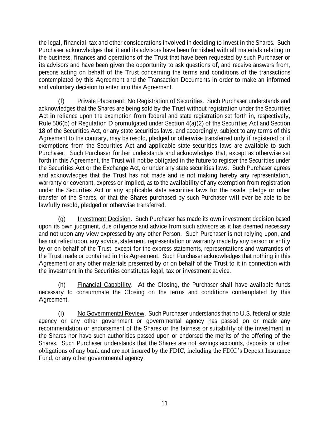 11 the legal, financial, tax and other considerations involved in deciding to invest in the Shares. Such Purchaser acknowledges that it and its advisors have been furnished with all materials relating to the business, finances and operations of the Trust that have been requested by such Purchaser or its advisors and have been given the opportunity to ask questions of, and receive answers from, persons acting on behalf of the Trust concerning the terms and conditions of the transactions contemplated by this Agreement and the Transaction Documents in order to make an informed and voluntary decision to enter into this Agreement. (f) Private Placement; No Registration of Securities. Such Purchaser understands and acknowledges that the Shares are being sold by the Trust without registration under the Securities Act in reliance upon the exemption from federal and state registration set forth in, respectively, Rule 506(b) of Regulation D promulgated under Section 4(a)(2) of the Securities Act and Section 18 of the Securities Act, or any state securities laws, and accordingly, subject to any terms of this Agreement to the contrary, may be resold, pledged or otherwise transferred only if registered or if exemptions from the Securities Act and applicable state securities laws are available to such Purchaser. Such Purchaser further understands and acknowledges that, except as otherwise set forth in this Agreement, the Trust will not be obligated in the future to register the Securities under the Securities Act or the Exchange Act, or under any state securities laws. Such Purchaser agrees and acknowledges that the Trust has not made and is not making hereby any representation, warranty or covenant, express or implied, as to the availability of any exemption from registration under the Securities Act or any applicable state securities laws for the resale, pledge or other transfer of the Shares, or that the Shares purchased by such Purchaser will ever be able to be lawfully resold, pledged or otherwise transferred. (g) Investment Decision. Such Purchaser has made its own investment decision based upon its own judgment, due diligence and advice from such advisors as it has deemed necessary and not upon any view expressed by any other Person. Such Purchaser is not relying upon, and has not relied upon, any advice, statement, representation or warranty made by any person or entity by or on behalf of the Trust, except for the express statements, representations and warranties of the Trust made or contained in this Agreement. Such Purchaser acknowledges that nothing in this Agreement or any other materials presented by or on behalf of the Trust to it in connection with the investment in the Securities constitutes legal, tax or investment advice. (h) Financial Capability. At the Closing, the Purchaser shall have available funds necessary to consummate the Closing on the terms and conditions contemplated by this Agreement. (i) No Governmental Review. Such Purchaser understands that no U.S. federal or state agency or any other government or governmental agency has passed on or made any recommendation or endorsement of the Shares or the fairness or suitability of the investment in the Shares nor have such authorities passed upon or endorsed the merits of the offering of the Shares. Such Purchaser understands that the Shares are not savings accounts, deposits or other obligations of any bank and are not insured by the FDIC, including the FDIC’s Deposit Insurance Fund, or any other governmental agency.