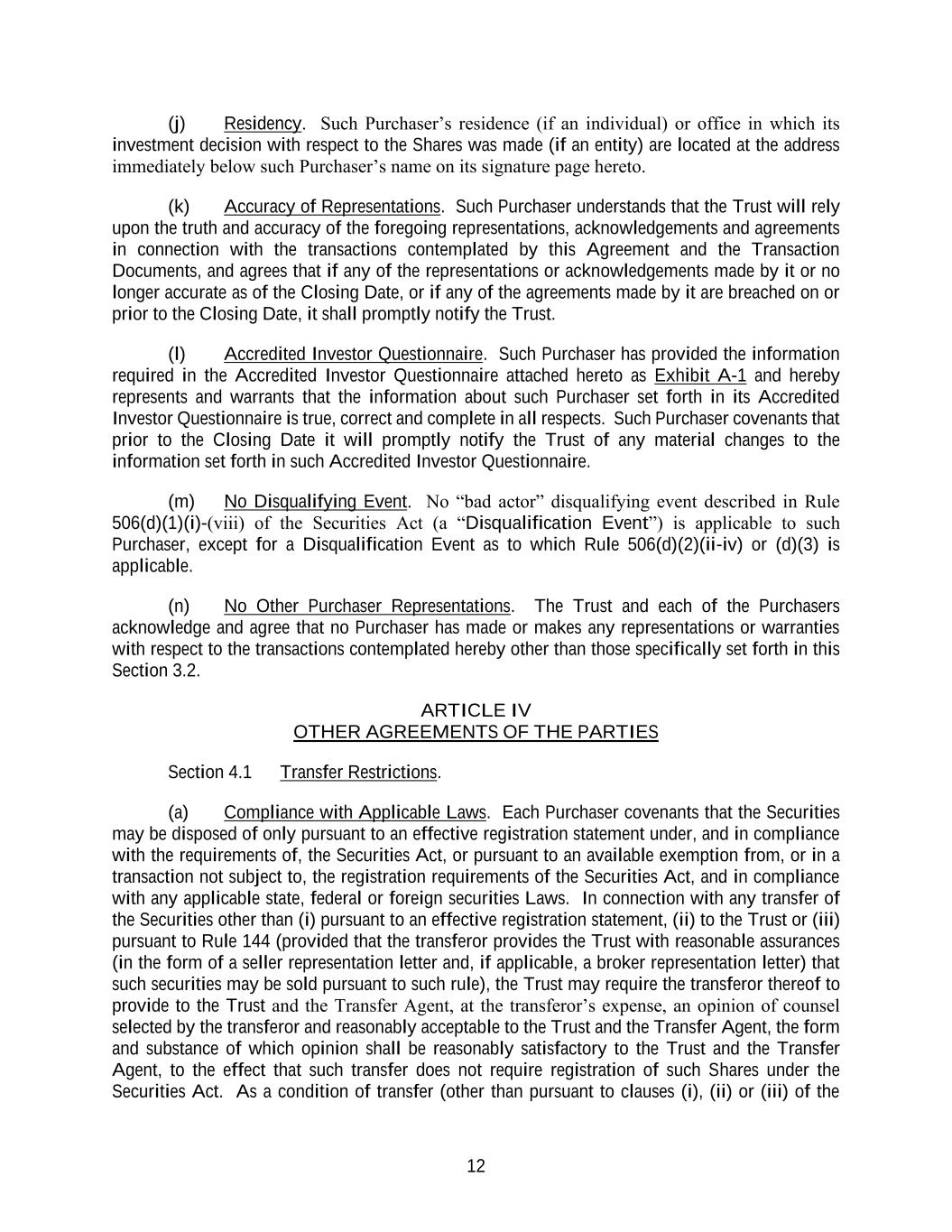 12 (j) Residency. Such Purchaser’s residence (if an individual) or office in which its investment decision with respect to the Shares was made (if an entity) are located at the address immediately below such Purchaser’s name on its signature page hereto. (k) Accuracy of Representations. Such Purchaser understands that the Trust will rely upon the truth and accuracy of the foregoing representations, acknowledgements and agreements in connection with the transactions contemplated by this Agreement and the Transaction Documents, and agrees that if any of the representations or acknowledgements made by it or no longer accurate as of the Closing Date, or if any of the agreements made by it are breached on or prior to the Closing Date, it shall promptly notify the Trust. (l) Accredited Investor Questionnaire. Such Purchaser has provided the information required in the Accredited Investor Questionnaire attached hereto as Exhibit A-1 and hereby represents and warrants that the information about such Purchaser set forth in its Accredited Investor Questionnaire is true, correct and complete in all respects. Such Purchaser covenants that prior to the Closing Date it will promptly notify the Trust of any material changes to the information set forth in such Accredited Investor Questionnaire. (m) No Disqualifying Event. No “bad actor” disqualifying event described in Rule 506(d)(1)(i)-(viii) of the Securities Act (a “Disqualification Event”) is applicable to such Purchaser, except for a Disqualification Event as to which Rule 506(d)(2)(ii-iv) or (d)(3) is applicable. (n) No Other Purchaser Representations. The Trust and each of the Purchasers acknowledge and agree that no Purchaser has made or makes any representations or warranties with respect to the transactions contemplated hereby other than those specifically set forth in this Section 3.2. ARTICLE IV OTHER AGREEMENTS OF THE PARTIES Section 4.1 Transfer Restrictions. (a) Compliance with Applicable Laws. Each Purchaser covenants that the Securities may be disposed of only pursuant to an effective registration statement under, and in compliance with the requirements of, the Securities Act, or pursuant to an available exemption from, or in a transaction not subject to, the registration requirements of the Securities Act, and in compliance with any applicable state, federal or foreign securities Laws. In connection with any transfer of the Securities other than (i) pursuant to an effective registration statement, (ii) to the Trust or (iii) pursuant to Rule 144 (provided that the transferor provides the Trust with reasonable assurances (in the form of a seller representation letter and, if applicable, a broker representation letter) that such securities may be sold pursuant to such rule), the Trust may require the transferor thereof to provide to the Trust and the Transfer Agent, at the transferor’s expense, an opinion of counsel selected by the transferor and reasonably acceptable to the Trust and the Transfer Agent, the form and substance of which opinion shall be reasonably satisfactory to the Trust and the Transfer Agent, to the effect that such transfer does not require registration of such Shares under the Securities Act. As a condition of transfer (other than pursuant to clauses (i), (ii) or (iii) of the