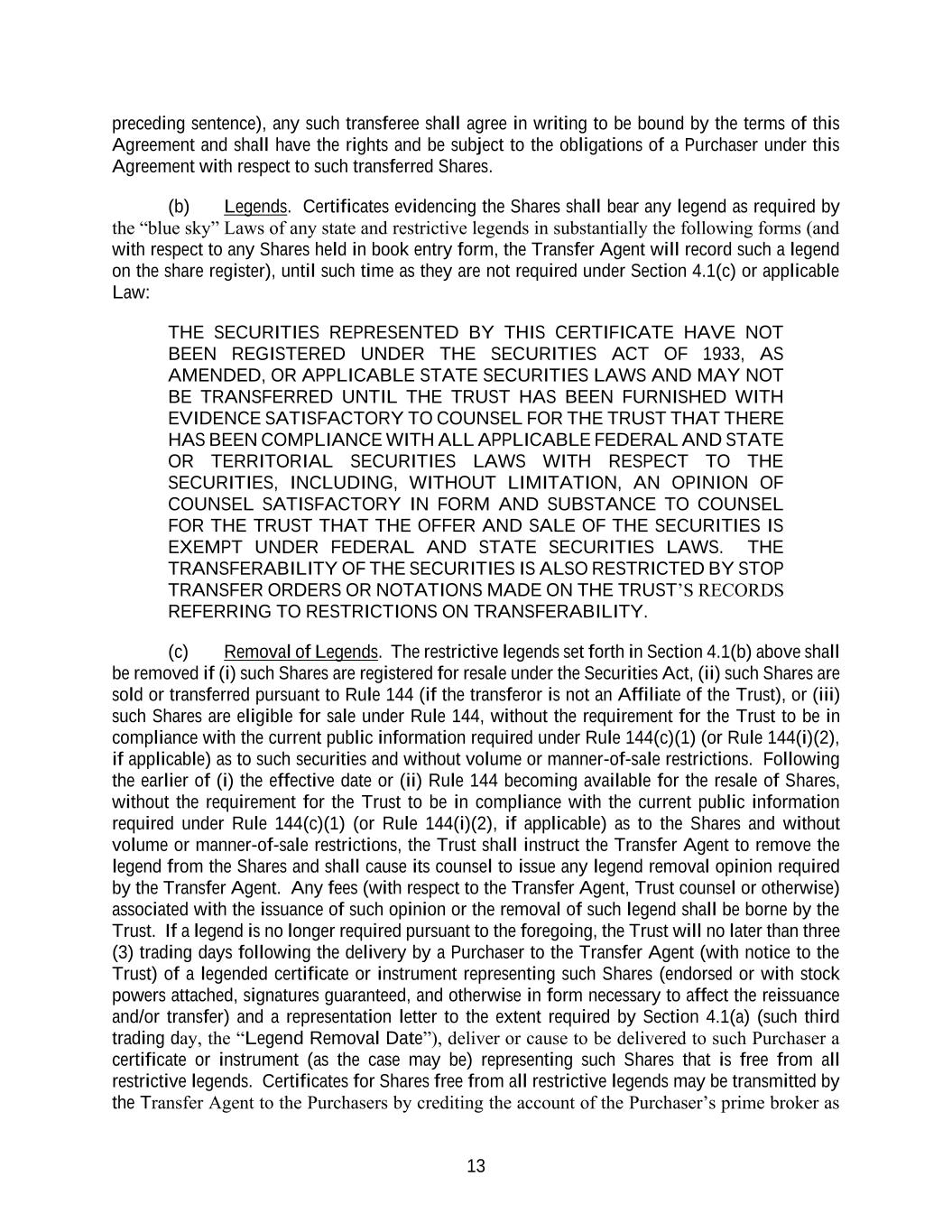 13 preceding sentence), any such transferee shall agree in writing to be bound by the terms of this Agreement and shall have the rights and be subject to the obligations of a Purchaser under this Agreement with respect to such transferred Shares. (b) Legends. Certificates evidencing the Shares shall bear any legend as required by the “blue sky” Laws of any state and restrictive legends in substantially the following forms (and with respect to any Shares held in book entry form, the Transfer Agent will record such a legend on the share register), until such time as they are not required under Section 4.1(c) or applicable Law: THE SECURITIES REPRESENTED BY THIS CERTIFICATE HAVE NOT BEEN REGISTERED UNDER THE SECURITIES ACT OF 1933, AS AMENDED, OR APPLICABLE STATE SECURITIES LAWS AND MAY NOT BE TRANSFERRED UNTIL THE TRUST HAS BEEN FURNISHED WITH EVIDENCE SATISFACTORY TO COUNSEL FOR THE TRUST THAT THERE HAS BEEN COMPLIANCE WITH ALL APPLICABLE FEDERAL AND STATE OR TERRITORIAL SECURITIES LAWS WITH RESPECT TO THE SECURITIES, INCLUDING, WITHOUT LIMITATION, AN OPINION OF COUNSEL SATISFACTORY IN FORM AND SUBSTANCE TO COUNSEL FOR THE TRUST THAT THE OFFER AND SALE OF THE SECURITIES IS EXEMPT UNDER FEDERAL AND STATE SECURITIES LAWS. THE TRANSFERABILITY OF THE SECURITIES IS ALSO RESTRICTED BY STOP TRANSFER ORDERS OR NOTATIONS MADE ON THE TRUST’S RECORDS REFERRING TO RESTRICTIONS ON TRANSFERABILITY. (c) Removal of Legends. The restrictive legends set forth in Section 4.1(b) above shall be removed if (i) such Shares are registered for resale under the Securities Act, (ii) such Shares are sold or transferred pursuant to Rule 144 (if the transferor is not an Affiliate of the Trust), or (iii) such Shares are eligible for sale under Rule 144, without the requirement for the Trust to be in compliance with the current public information required under Rule 144(c)(1) (or Rule 144(i)(2), if applicable) as to such securities and without volume or manner-of-sale restrictions. Following the earlier of (i) the effective date or (ii) Rule 144 becoming available for the resale of Shares, without the requirement for the Trust to be in compliance with the current public information required under Rule 144(c)(1) (or Rule 144(i)(2), if applicable) as to the Shares and without volume or manner-of-sale restrictions, the Trust shall instruct the Transfer Agent to remove the legend from the Shares and shall cause its counsel to issue any legend removal opinion required by the Transfer Agent. Any fees (with respect to the Transfer Agent, Trust counsel or otherwise) associated with the issuance of such opinion or the removal of such legend shall be borne by the Trust. If a legend is no longer required pursuant to the foregoing, the Trust will no later than three (3) trading days following the delivery by a Purchaser to the Transfer Agent (with notice to the Trust) of a legended certificate or instrument representing such Shares (endorsed or with stock powers attached, signatures guaranteed, and otherwise in form necessary to affect the reissuance and/or transfer) and a representation letter to the extent required by Section 4.1(a) (such third trading day, the “Legend Removal Date”), deliver or cause to be delivered to such Purchaser a certificate or instrument (as the case may be) representing such Shares that is free from all restrictive legends. Certificates for Shares free from all restrictive legends may be transmitted by the Transfer Agent to the Purchasers by crediting the account of the Purchaser’s prime broker as