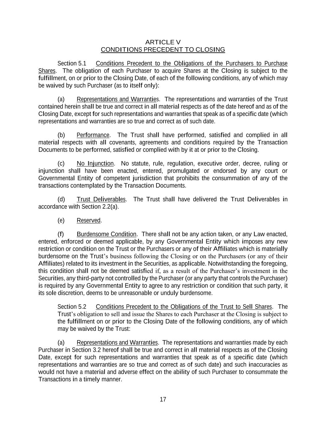 17 ARTICLE V CONDITIONS PRECEDENT TO CLOSING Section 5.1 Conditions Precedent to the Obligations of the Purchasers to Purchase Shares. The obligation of each Purchaser to acquire Shares at the Closing is subject to the fulfillment, on or prior to the Closing Date, of each of the following conditions, any of which may be waived by such Purchaser (as to itself only): (a) Representations and Warranties. The representations and warranties of the Trust contained herein shall be true and correct in all material respects as of the date hereof and as of the Closing Date, except for such representations and warranties that speak as of a specific date (which representations and warranties are so true and correct as of such date. (b) Performance. The Trust shall have performed, satisfied and complied in all material respects with all covenants, agreements and conditions required by the Transaction Documents to be performed, satisfied or complied with by it at or prior to the Closing. (c) No Injunction. No statute, rule, regulation, executive order, decree, ruling or injunction shall have been enacted, entered, promulgated or endorsed by any court or Governmental Entity of competent jurisdiction that prohibits the consummation of any of the transactions contemplated by the Transaction Documents. (d) Trust Deliverables. The Trust shall have delivered the Trust Deliverables in accordance with Section 2.2(a). (e) Reserved. (f) Burdensome Condition. There shall not be any action taken, or any Law enacted, entered, enforced or deemed applicable, by any Governmental Entity which imposes any new restriction or condition on the Trust or the Purchasers or any of their Affiliates which is materially burdensome on the Trust’s business following the Closing or on the Purchasers (or any of their Affiliates) related to its investment in the Securities, as applicable. Notwithstanding the foregoing, this condition shall not be deemed satisfied if, as a result of the Purchaser’s investment in the Securities, any third-party not controlled by the Purchaser (or any party that controls the Purchaser) is required by any Governmental Entity to agree to any restriction or condition that such party, it its sole discretion, deems to be unreasonable or unduly burdensome. Section 5.2 Conditions Precedent to the Obligations of the Trust to Sell Shares. The Trust’s obligation to sell and issue the Shares to each Purchaser at the Closing is subject to the fulfillment on or prior to the Closing Date of the following conditions, any of which may be waived by the Trust: (a) Representations and Warranties. The representations and warranties made by each Purchaser in Section 3.2 hereof shall be true and correct in all material respects as of the Closing Date, except for such representations and warranties that speak as of a specific date (which representations and warranties are so true and correct as of such date) and such inaccuracies as would not have a material and adverse effect on the ability of such Purchaser to consummate the Transactions in a timely manner.