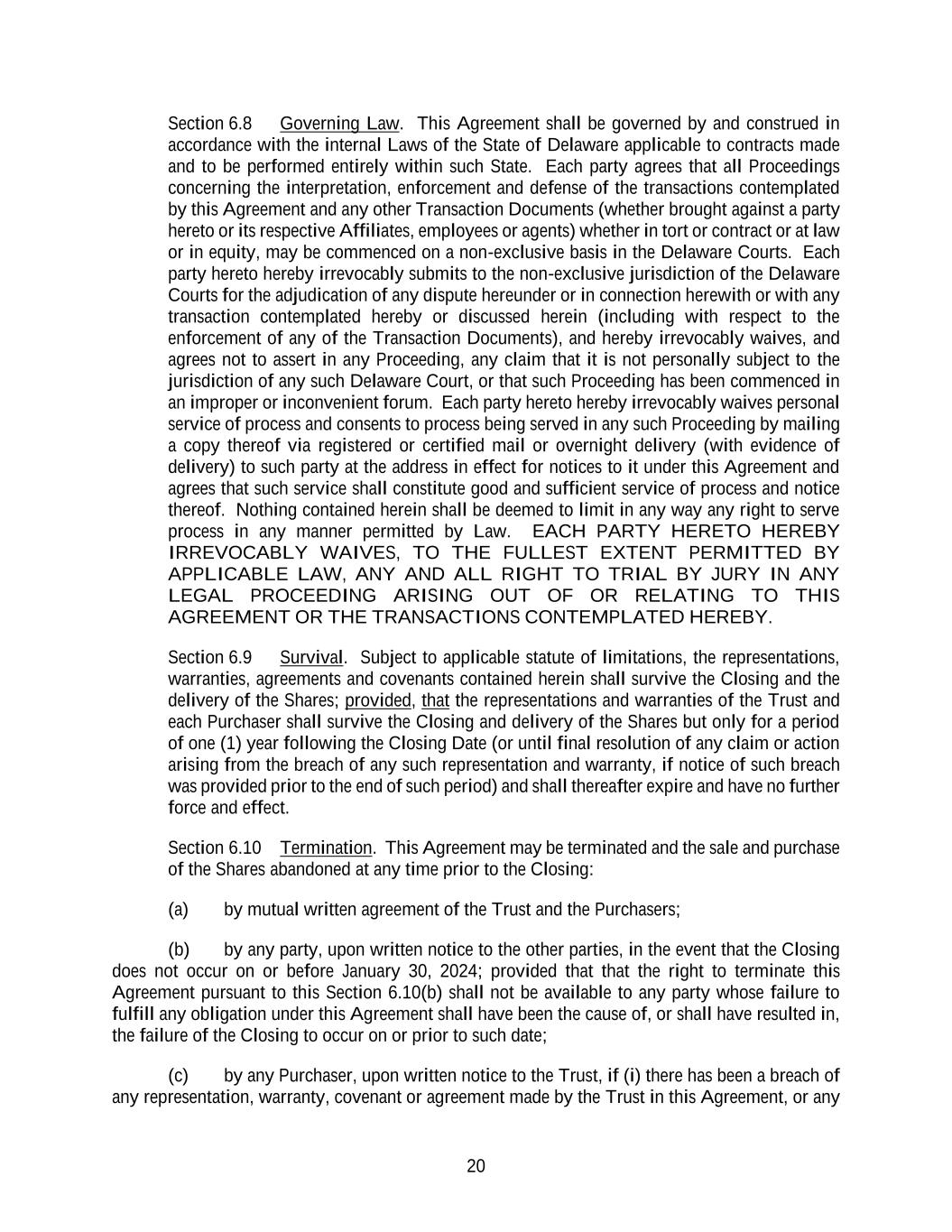 20 Section 6.8 Governing Law. This Agreement shall be governed by and construed in accordance with the internal Laws of the State of Delaware applicable to contracts made and to be performed entirely within such State. Each party agrees that all Proceedings concerning the interpretation, enforcement and defense of the transactions contemplated by this Agreement and any other Transaction Documents (whether brought against a party hereto or its respective Affiliates, employees or agents) whether in tort or contract or at law or in equity, may be commenced on a non-exclusive basis in the Delaware Courts. Each party hereto hereby irrevocably submits to the non-exclusive jurisdiction of the Delaware Courts for the adjudication of any dispute hereunder or in connection herewith or with any transaction contemplated hereby or discussed herein (including with respect to the enforcement of any of the Transaction Documents), and hereby irrevocably waives, and agrees not to assert in any Proceeding, any claim that it is not personally subject to the jurisdiction of any such Delaware Court, or that such Proceeding has been commenced in an improper or inconvenient forum. Each party hereto hereby irrevocably waives personal service of process and consents to process being served in any such Proceeding by mailing a copy thereof via registered or certified mail or overnight delivery (with evidence of delivery) to such party at the address in effect for notices to it under this Agreement and agrees that such service shall constitute good and sufficient service of process and notice thereof. Nothing contained herein shall be deemed to limit in any way any right to serve process in any manner permitted by Law. EACH PARTY HERETO HEREBY IRREVOCABLY WAIVES, TO THE FULLEST EXTENT PERMITTED BY APPLICABLE LAW, ANY AND ALL RIGHT TO TRIAL BY JURY IN ANY LEGAL PROCEEDING ARISING OUT OF OR RELATING TO THIS AGREEMENT OR THE TRANSACTIONS CONTEMPLATED HEREBY. Section 6.9 Survival. Subject to applicable statute of limitations, the representations, warranties, agreements and covenants contained herein shall survive the Closing and the delivery of the Shares; provided, that the representations and warranties of the Trust and each Purchaser shall survive the Closing and delivery of the Shares but only for a period of one (1) year following the Closing Date (or until final resolution of any claim or action arising from the breach of any such representation and warranty, if notice of such breach was provided prior to the end of such period) and shall thereafter expire and have no further force and effect. Section 6.10 Termination. This Agreement may be terminated and the sale and purchase of the Shares abandoned at any time prior to the Closing: (a) by mutual written agreement of the Trust and the Purchasers; (b) by any party, upon written notice to the other parties, in the event that the Closing does not occur on or before January 30, 2024; provided that that the right to terminate this Agreement pursuant to this Section 6.10(b) shall not be available to any party whose failure to fulfill any obligation under this Agreement shall have been the cause of, or shall have resulted in, the failure of the Closing to occur on or prior to such date; (c) by any Purchaser, upon written notice to the Trust, if (i) there has been a breach of any representation, warranty, covenant or agreement made by the Trust in this Agreement, or any