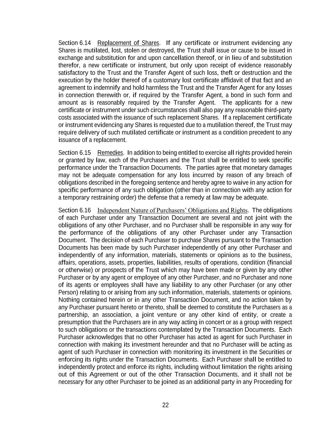 22 Section 6.14 Replacement of Shares. If any certificate or instrument evidencing any Shares is mutilated, lost, stolen or destroyed, the Trust shall issue or cause to be issued in exchange and substitution for and upon cancellation thereof, or in lieu of and substitution therefor, a new certificate or instrument, but only upon receipt of evidence reasonably satisfactory to the Trust and the Transfer Agent of such loss, theft or destruction and the execution by the holder thereof of a customary lost certificate affidavit of that fact and an agreement to indemnify and hold harmless the Trust and the Transfer Agent for any losses in connection therewith or, if required by the Transfer Agent, a bond in such form and amount as is reasonably required by the Transfer Agent. The applicants for a new certificate or instrument under such circumstances shall also pay any reasonable third-party costs associated with the issuance of such replacement Shares. If a replacement certificate or instrument evidencing any Shares is requested due to a mutilation thereof, the Trust may require delivery of such mutilated certificate or instrument as a condition precedent to any issuance of a replacement. Section 6.15 Remedies. In addition to being entitled to exercise all rights provided herein or granted by law, each of the Purchasers and the Trust shall be entitled to seek specific performance under the Transaction Documents. The parties agree that monetary damages may not be adequate compensation for any loss incurred by reason of any breach of obligations described in the foregoing sentence and hereby agree to waive in any action for specific performance of any such obligation (other than in connection with any action for a temporary restraining order) the defense that a remedy at law may be adequate. Section 6.16 Independent Nature of Purchasers’ Obligations and Rights. The obligations of each Purchaser under any Transaction Document are several and not joint with the obligations of any other Purchaser, and no Purchaser shall be responsible in any way for the performance of the obligations of any other Purchaser under any Transaction Document. The decision of each Purchaser to purchase Shares pursuant to the Transaction Documents has been made by such Purchaser independently of any other Purchaser and independently of any information, materials, statements or opinions as to the business, affairs, operations, assets, properties, liabilities, results of operations, condition (financial or otherwise) or prospects of the Trust which may have been made or given by any other Purchaser or by any agent or employee of any other Purchaser, and no Purchaser and none of its agents or employees shall have any liability to any other Purchaser (or any other Person) relating to or arising from any such information, materials, statements or opinions. Nothing contained herein or in any other Transaction Document, and no action taken by any Purchaser pursuant hereto or thereto, shall be deemed to constitute the Purchasers as a partnership, an association, a joint venture or any other kind of entity, or create a presumption that the Purchasers are in any way acting in concert or as a group with respect to such obligations or the transactions contemplated by the Transaction Documents. Each Purchaser acknowledges that no other Purchaser has acted as agent for such Purchaser in connection with making its investment hereunder and that no Purchaser will be acting as agent of such Purchaser in connection with monitoring its investment in the Securities or enforcing its rights under the Transaction Documents. Each Purchaser shall be entitled to independently protect and enforce its rights, including without limitation the rights arising out of this Agreement or out of the other Transaction Documents, and it shall not be necessary for any other Purchaser to be joined as an additional party in any Proceeding for