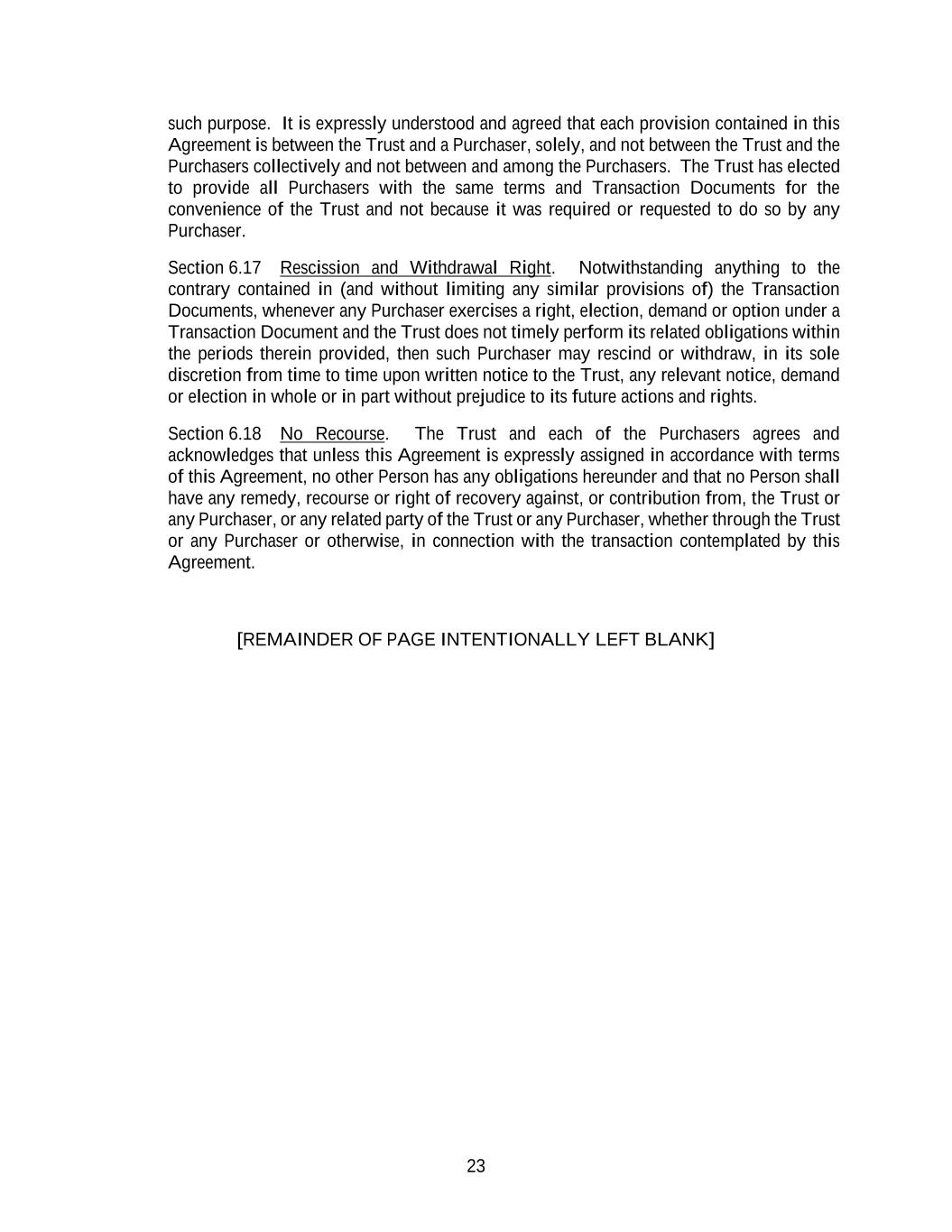 23 such purpose. It is expressly understood and agreed that each provision contained in this Agreement is between the Trust and a Purchaser, solely, and not between the Trust and the Purchasers collectively and not between and among the Purchasers. The Trust has elected to provide all Purchasers with the same terms and Transaction Documents for the convenience of the Trust and not because it was required or requested to do so by any Purchaser. Section 6.17 Rescission and Withdrawal Right. Notwithstanding anything to the contrary contained in (and without limiting any similar provisions of) the Transaction Documents, whenever any Purchaser exercises a right, election, demand or option under a Transaction Document and the Trust does not timely perform its related obligations within the periods therein provided, then such Purchaser may rescind or withdraw, in its sole discretion from time to time upon written notice to the Trust, any relevant notice, demand or election in whole or in part without prejudice to its future actions and rights. Section 6.18 No Recourse. The Trust and each of the Purchasers agrees and acknowledges that unless this Agreement is expressly assigned in accordance with terms of this Agreement, no other Person has any obligations hereunder and that no Person shall have any remedy, recourse or right of recovery against, or contribution from, the Trust or any Purchaser, or any related party of the Trust or any Purchaser, whether through the Trust or any Purchaser or otherwise, in connection with the transaction contemplated by this Agreement. [REMAINDER OF PAGE INTENTIONALLY LEFT BLANK]