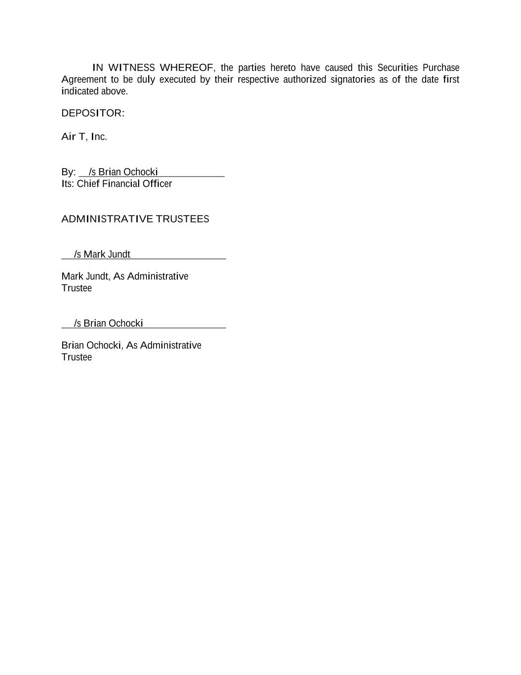 IN WITNESS WHEREOF, the parties hereto have caused this Securities Purchase Agreement to be duly executed by their respective authorized signatories as of the date first indicated above. DEPOSITOR: Air T, Inc. By: /s Brian Ochocki Its: Chief Financial Officer ADMINISTRATIVE TRUSTEES /s Mark Jundt Mark Jundt, As Administrative Trustee /s Brian Ochocki Brian Ochocki, As Administrative Trustee