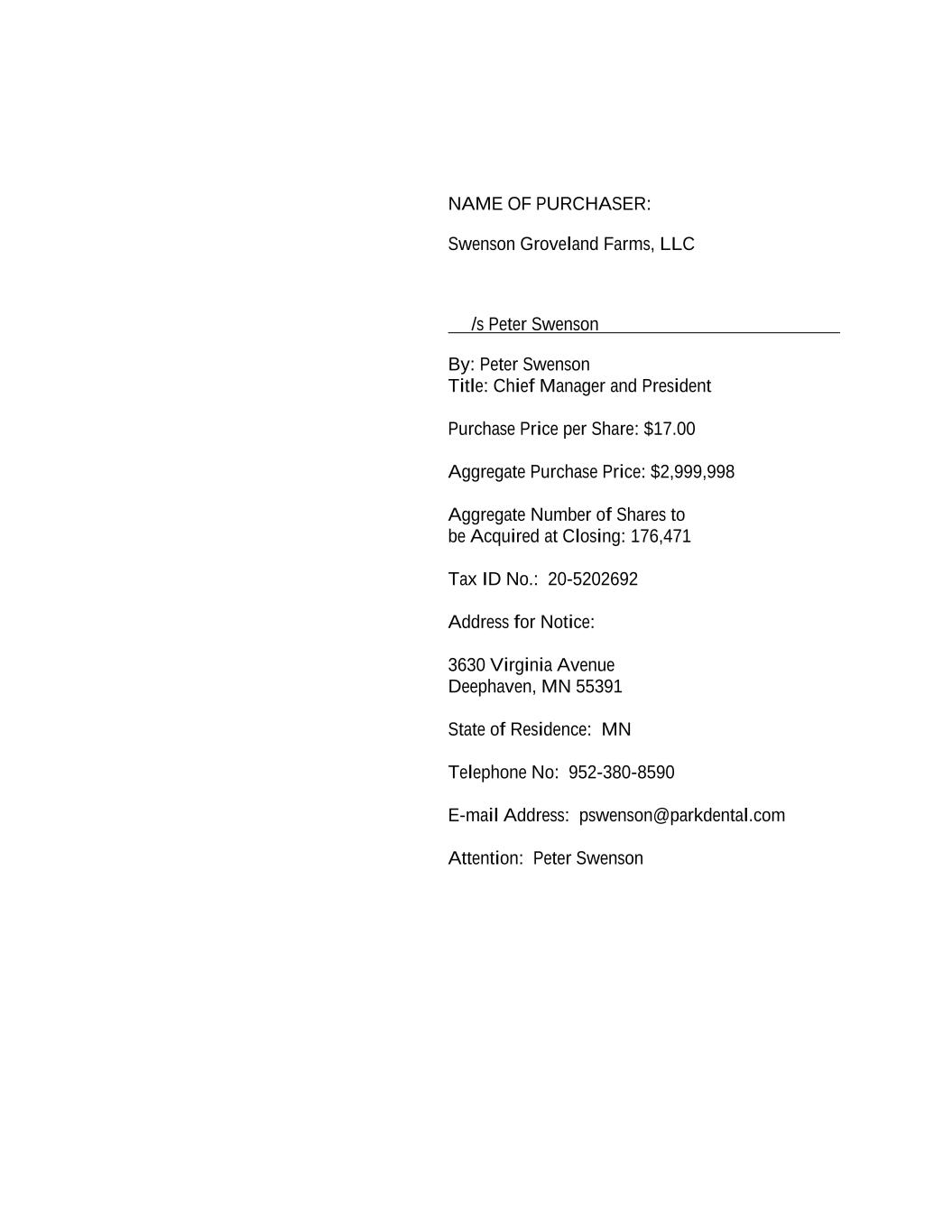 NAME OF PURCHASER: Swenson Groveland Farms, LLC /s Peter Swenson By: Peter Swenson Title: Chief Manager and President Purchase Price per Share: $17.00 Aggregate Purchase Price: $2,999,998 Aggregate Number of Shares to be Acquired at Closing: 176,471 Tax ID No.: 20-5202692 Address for Notice: 3630 Virginia Avenue Deephaven, MN 55391 State of Residence: MN Telephone No: 952-380-8590 E-mail Address: pswenson@parkdental.com Attention: Peter Swenson