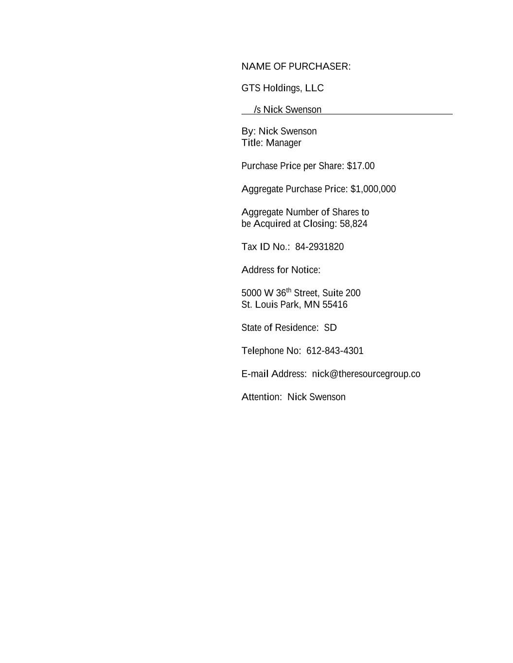 NAME OF PURCHASER: GTS Holdings, LLC /s Nick Swenson By: Nick Swenson Title: Manager Purchase Price per Share: $17.00 Aggregate Purchase Price: $1,000,000 Aggregate Number of Shares to be Acquired at Closing: 58,824 Tax ID No.: 84-2931820 Address for Notice: 5000 W 36th Street, Suite 200 St. Louis Park, MN 55416 State of Residence: SD Telephone No: 612-843-4301 E-mail Address: nick@theresourcegroup.co Attention: Nick Swenson